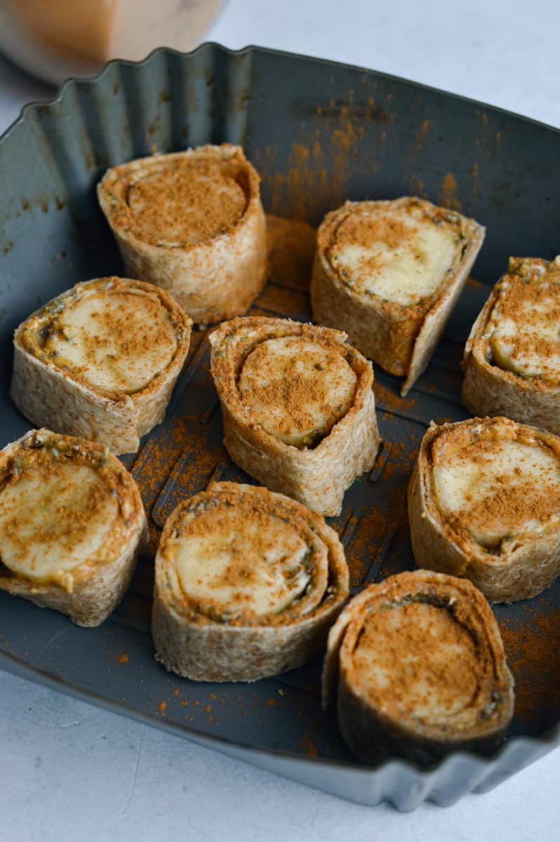 Place the pieces in a single layer in your air fryer basket. Sprinkle cinnamon over them. Cook for about 8 minutes until the tops are brown and the banana is soft.