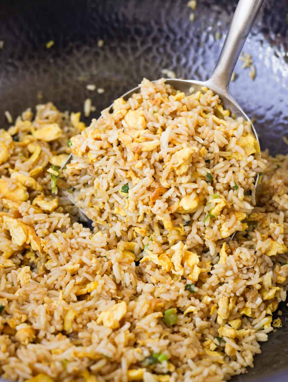 Take the pan off the heat. Serve your egg fried rice right away while it’s hot.