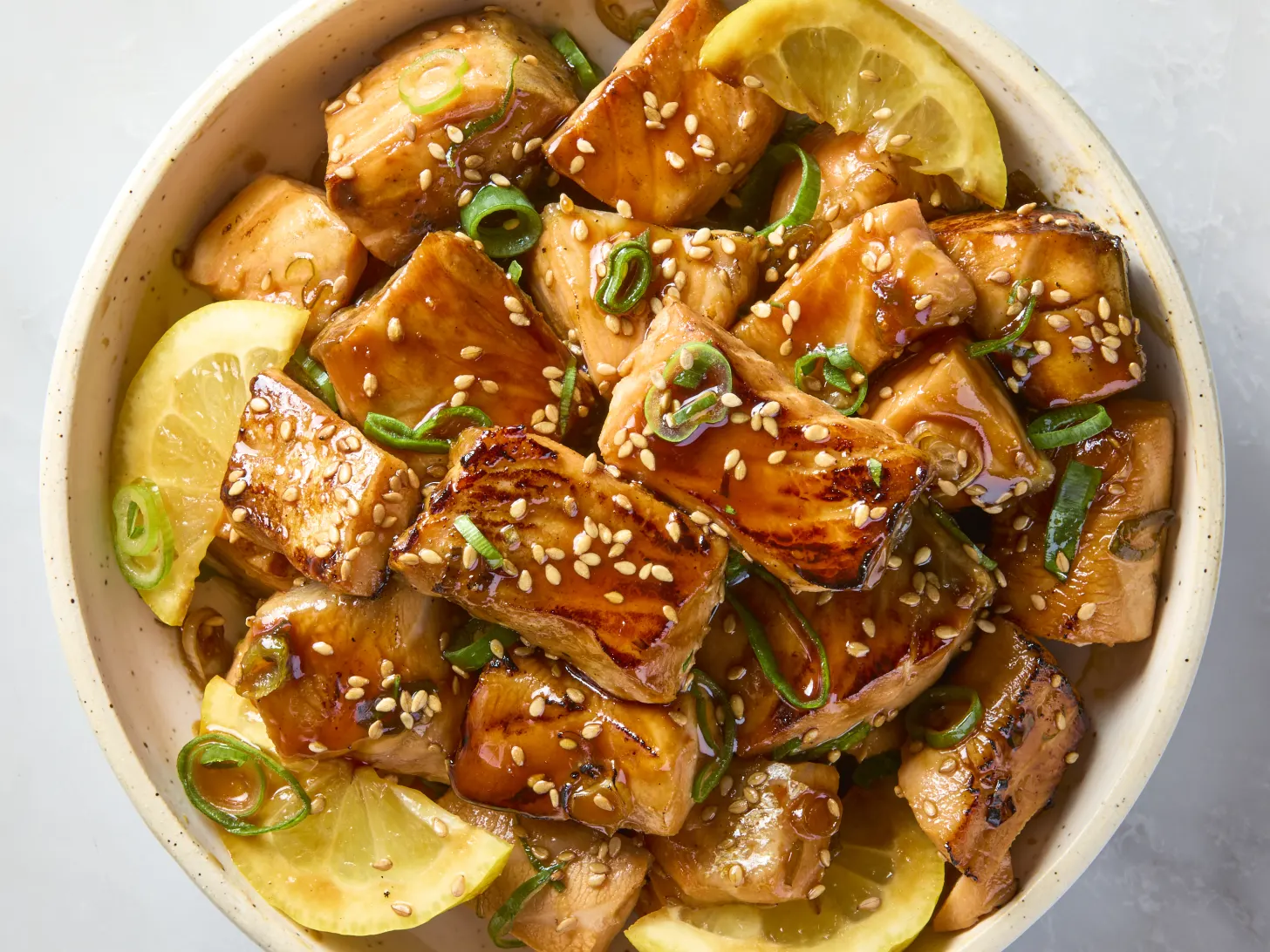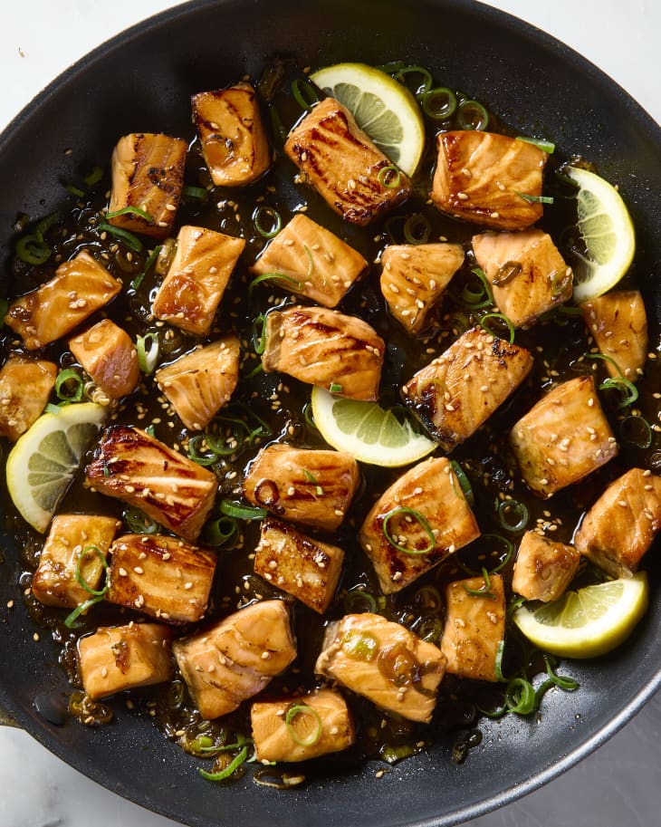 Serve your honey-glazed salmon bites right away with those lemon wedges on the side. Enjoy your quick and delicious meal!