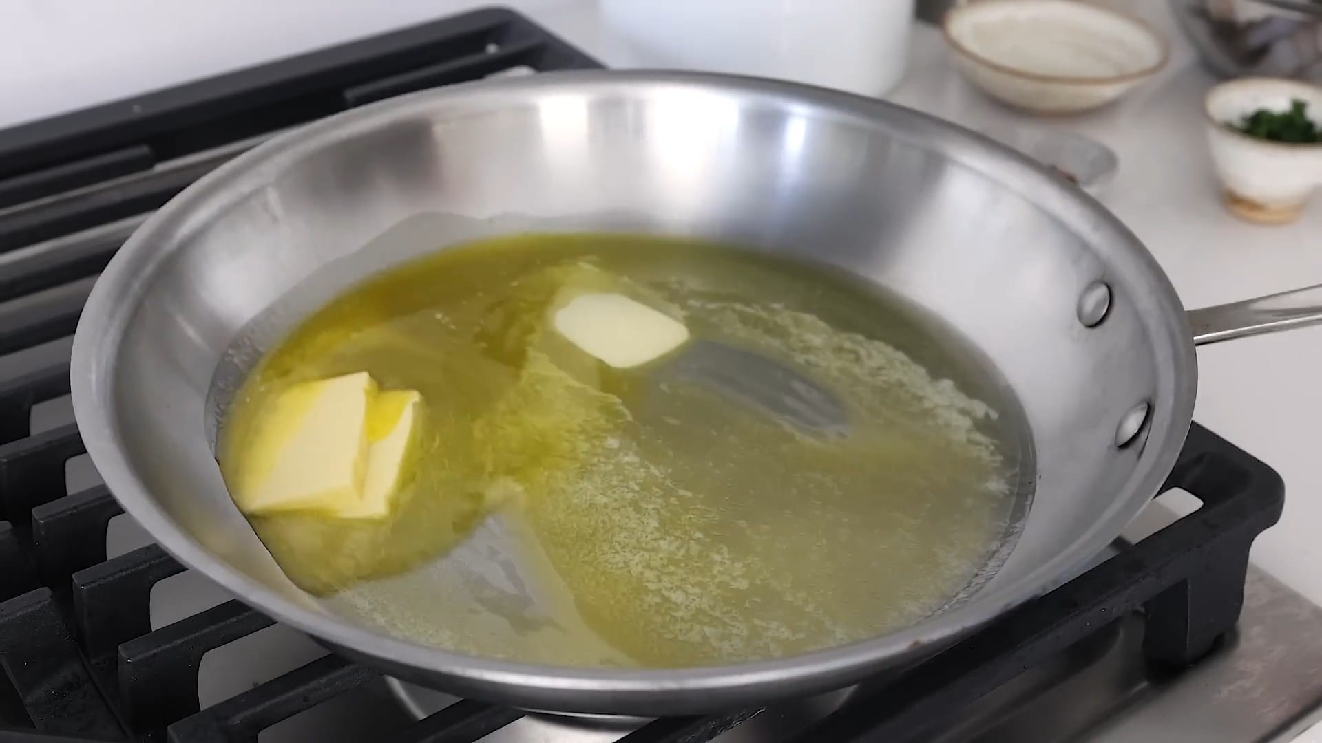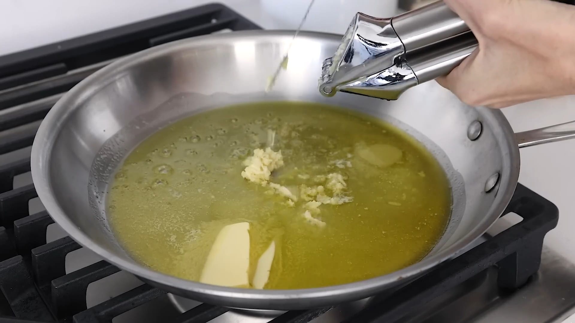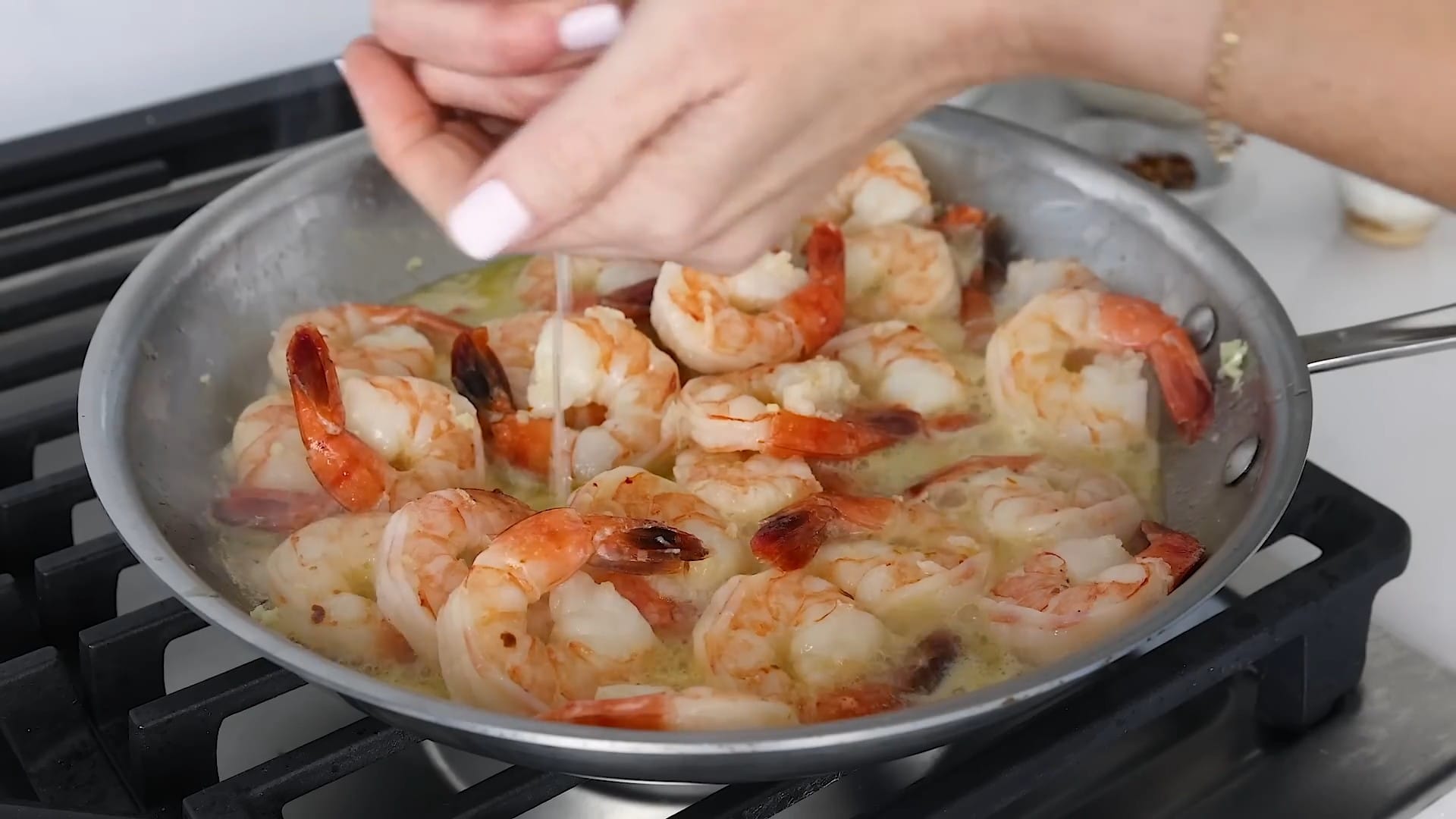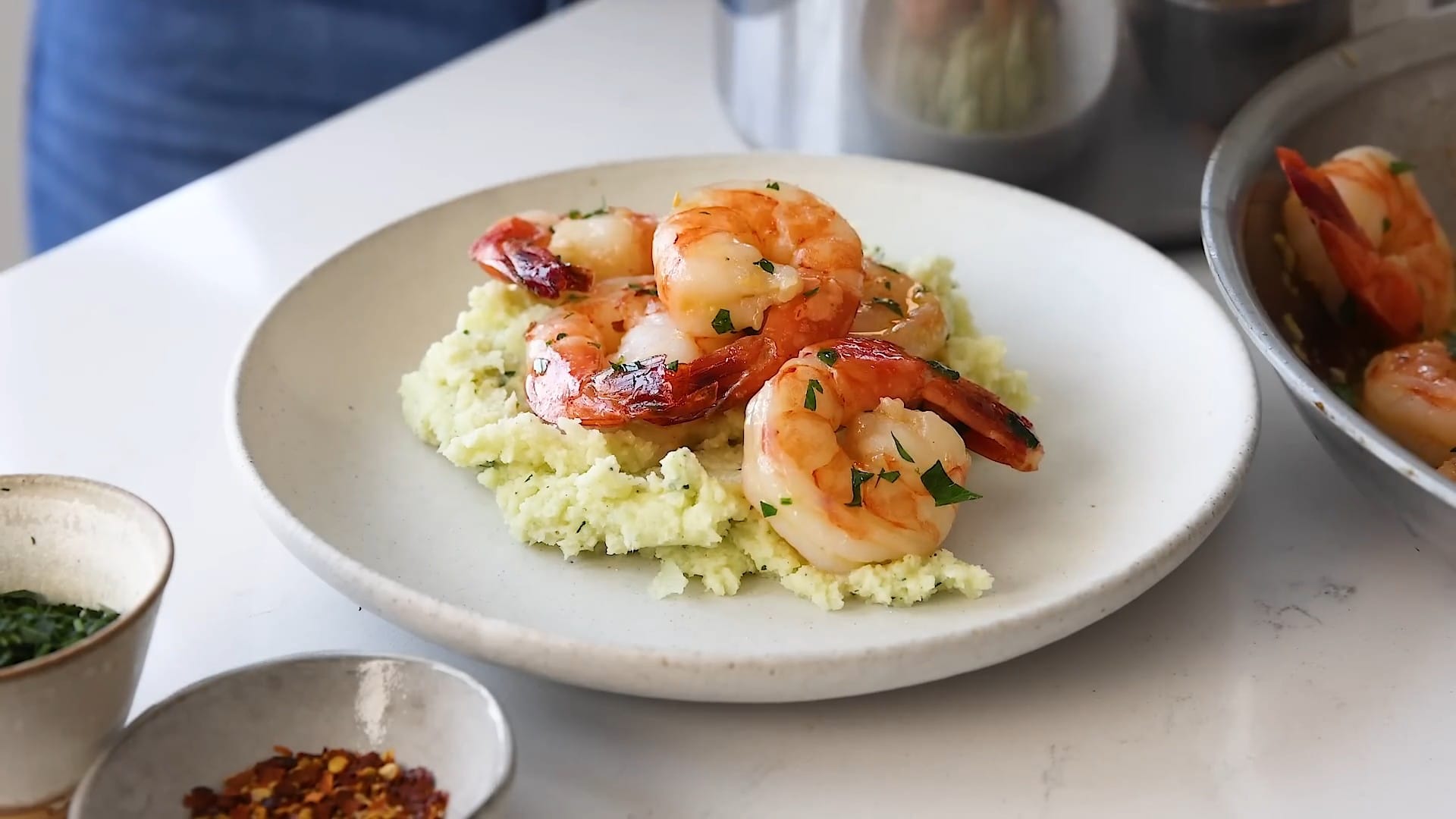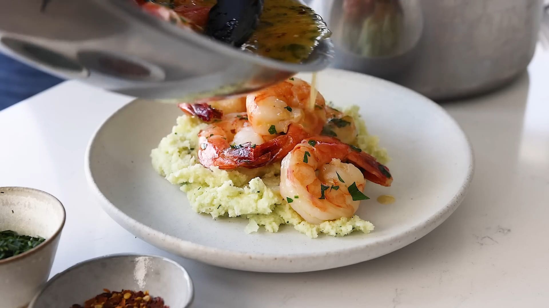 Drizzle the lemon garlic butter sauce from the skillet over the shrimp and mash.