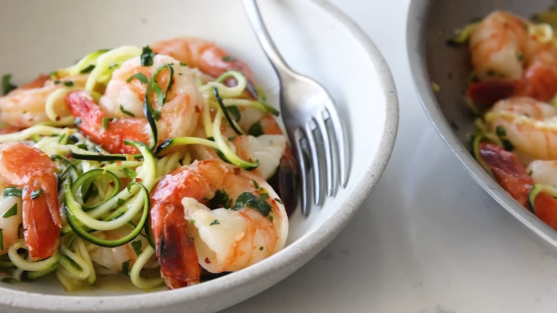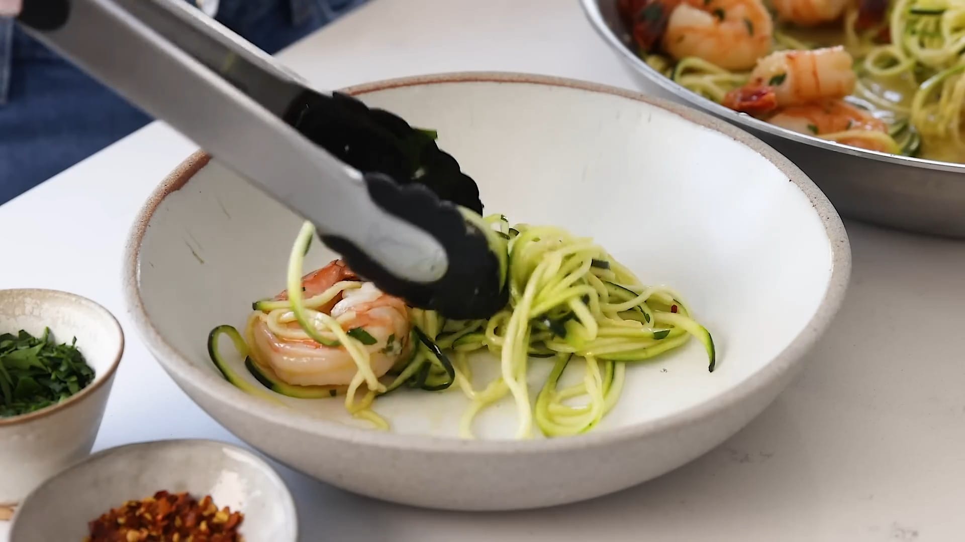 Add zucchini noodles to the remaining shrimp and sauce in the skillet.
