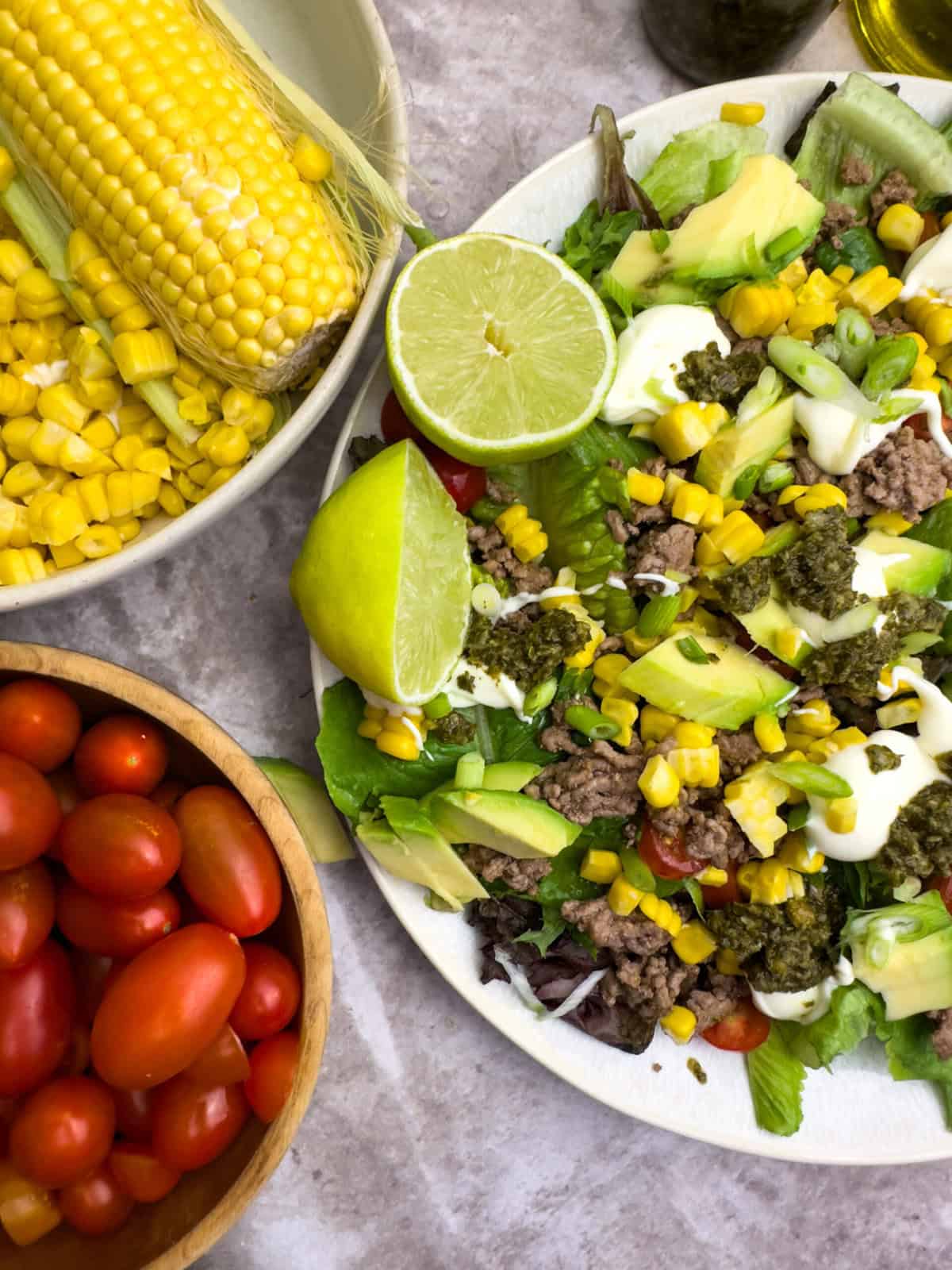 Now it’s time to build your salad! Put the lettuce on a plate first. Add the tomatoes, spring onions, beef, and corn on top.