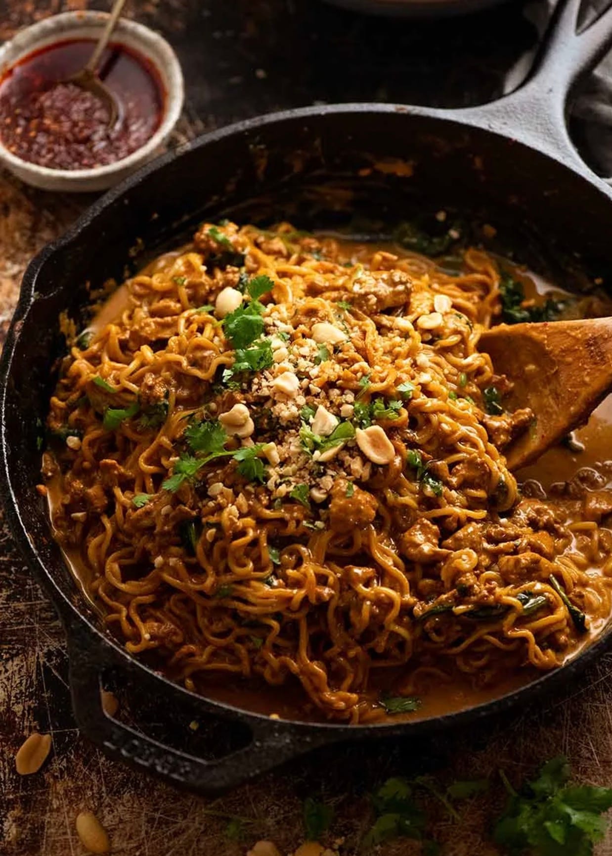 Serve right away topped with chopped peanuts and cilantro. Add sriracha if you like it spicy.