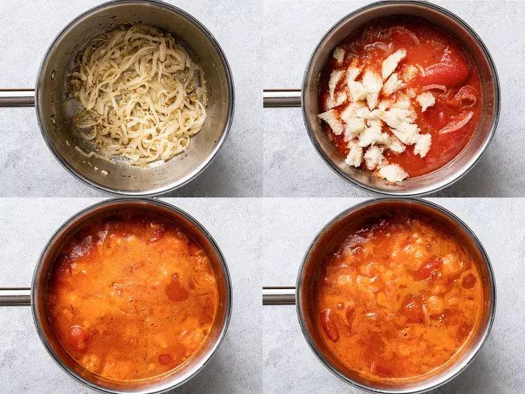 Next, add bread pieces and canned tomatoes. Mash the tomatoes with a whisk or potato masher. Pour in water and bring it to a boil. Then lower the heat and let it simmer for 5 minutes.