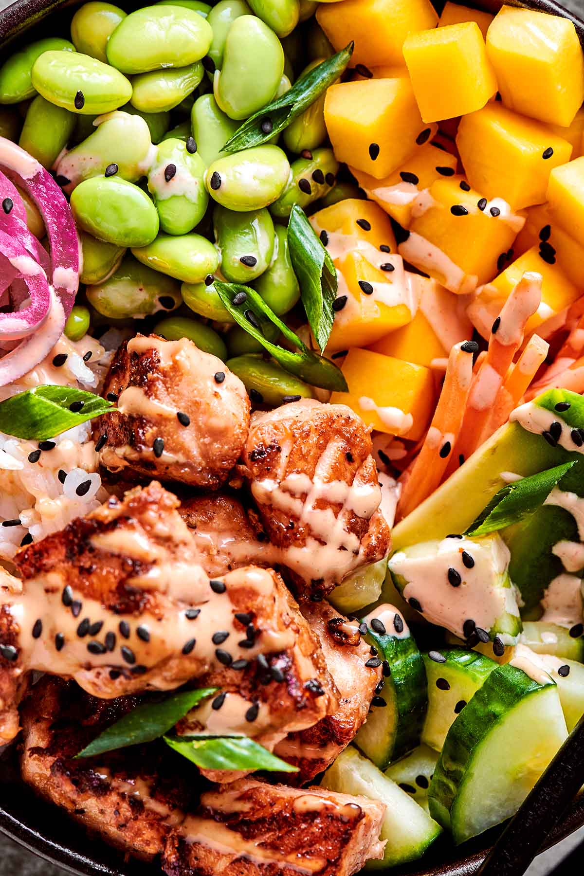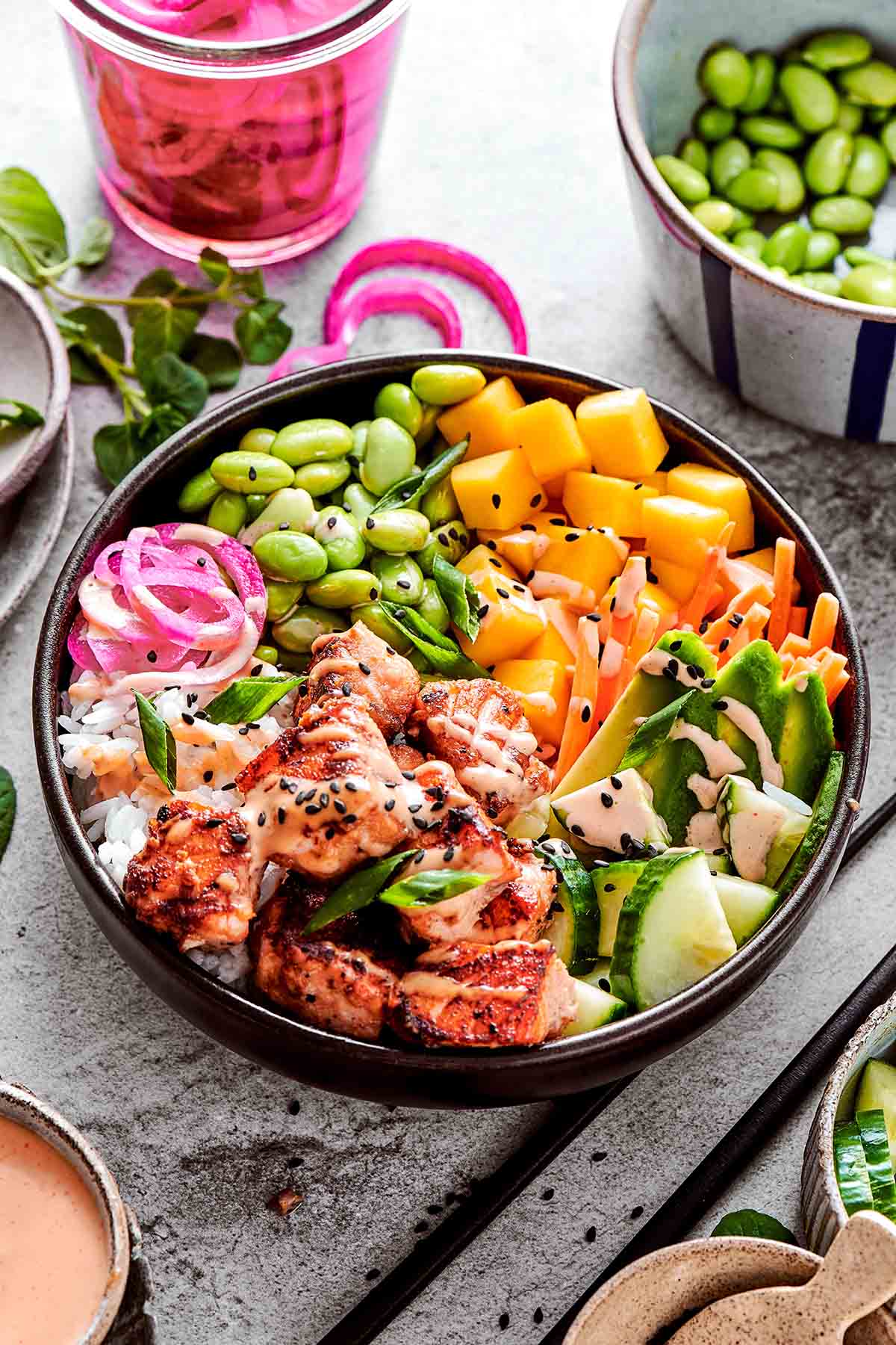 Assemble your bowl. Add the cooked salmon, sliced avocado, carrots, cucumber, and edamame on top of the rice.