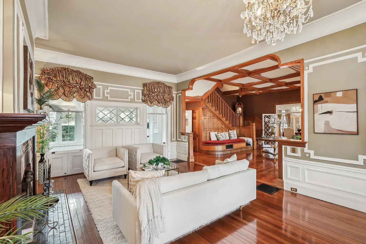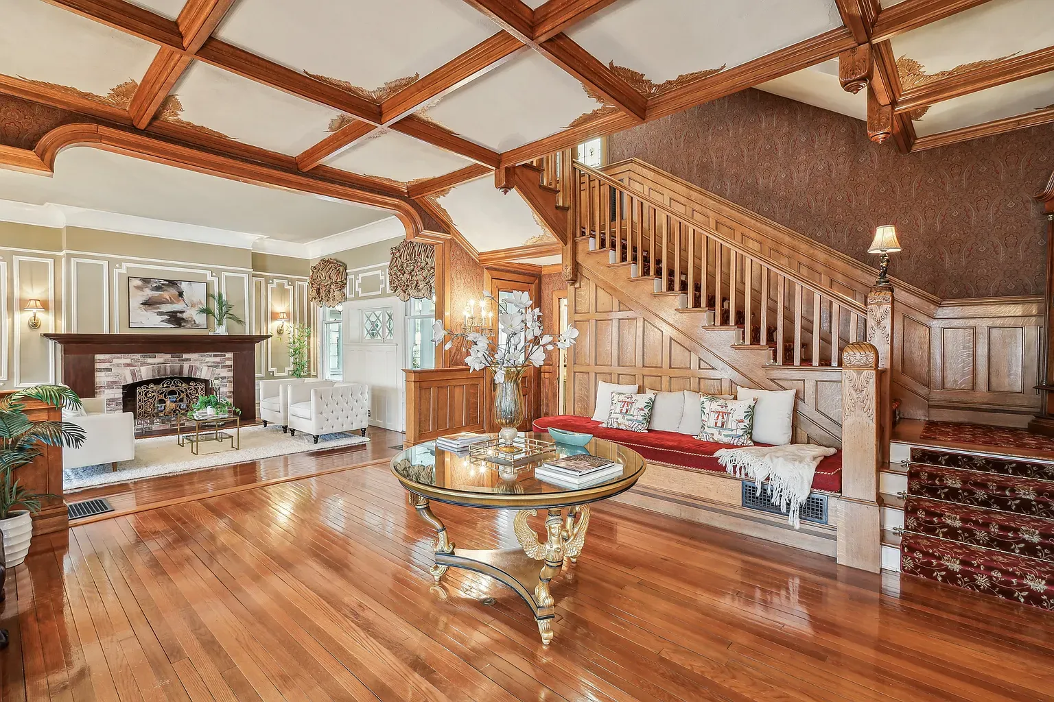 Step into a world where history and luxury coexist beautifully in this classic Queen Anne Victorian, a true masterpiece located near Long Island’s Great South Bay. This home, featured on HGTV’s “If These Walls Could Talk,” boasts exquisite craftsmanship, including hand-carved oak woodwork, coffered hand-painted ceilings, and striking Tiffany-style stained-glass windows.