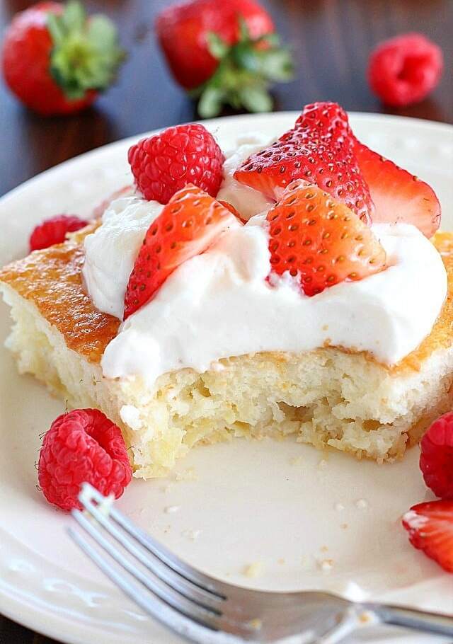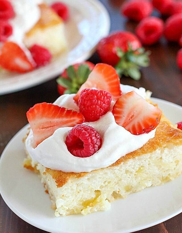 Once cooled, cut the cake into squares. Top each piece with a dollop of whipped cream and some fresh fruit. Enjoy your super easy, super tasty fluff cake!