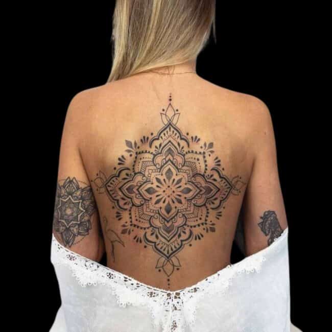 Sacred geometry meets feminine grace in this breathtaking mandala masterpiece that transforms the entire back into a canvas of spiritual artistry. The intricate dotwork and delicate linework create a mesmerizing symmetrical design that flows seamlessly from spine to shoulders, while matching arm pieces complete this stunning bohemian vision ✨ Perfect proof that large-scale tattoos can be both bold and beautifully elegant. This is a design that radiates grounded energy and free spirit.