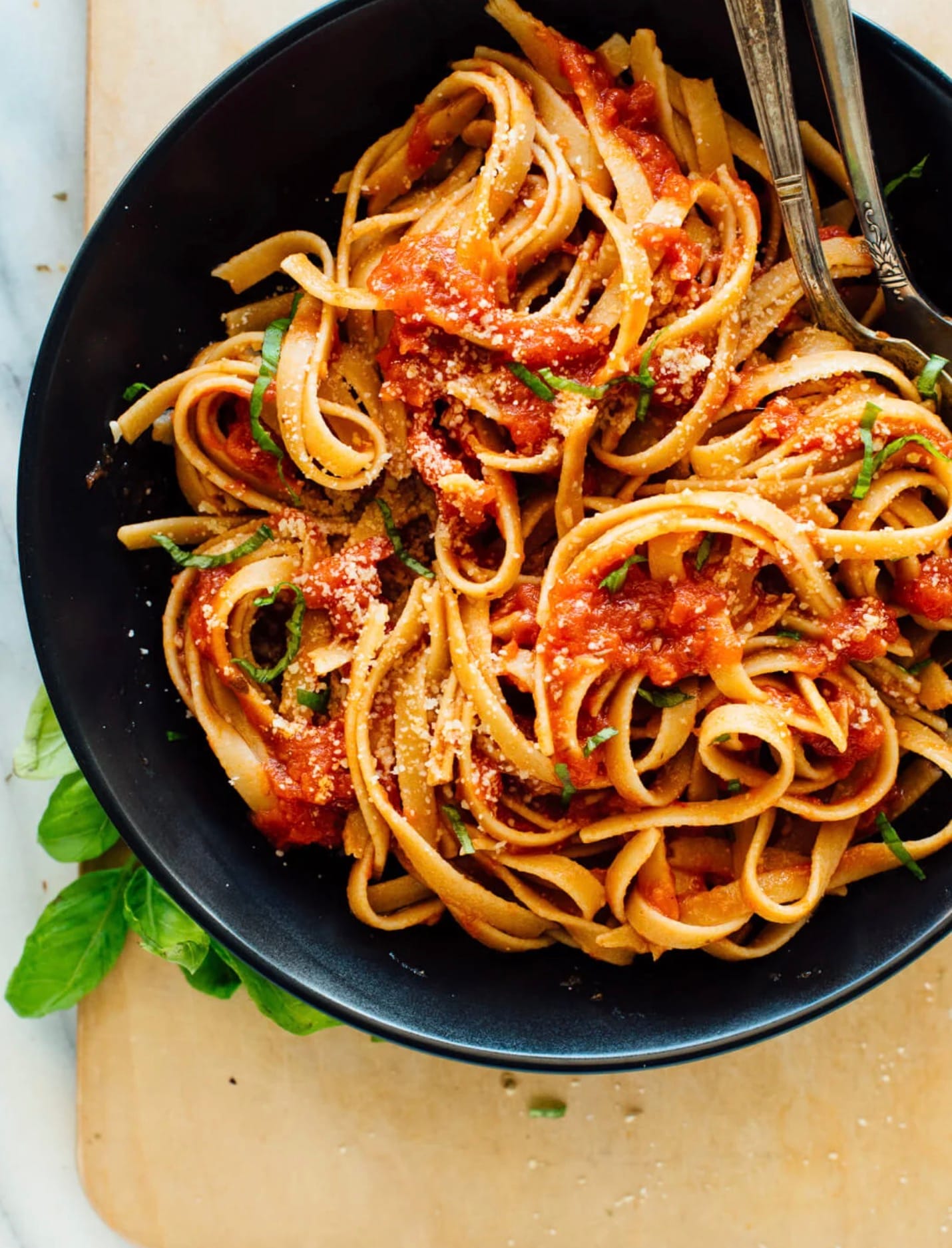 A simple pasta dish with a bright, fresh tomato sauce made entirely with pantry ingredients.