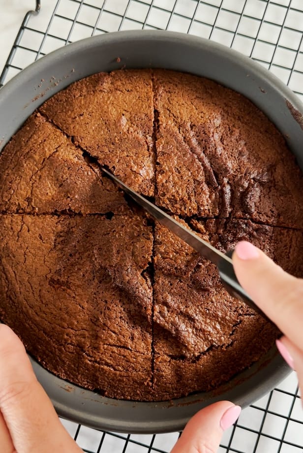Cut the cake into 8 triangles while it’s still in the tin.