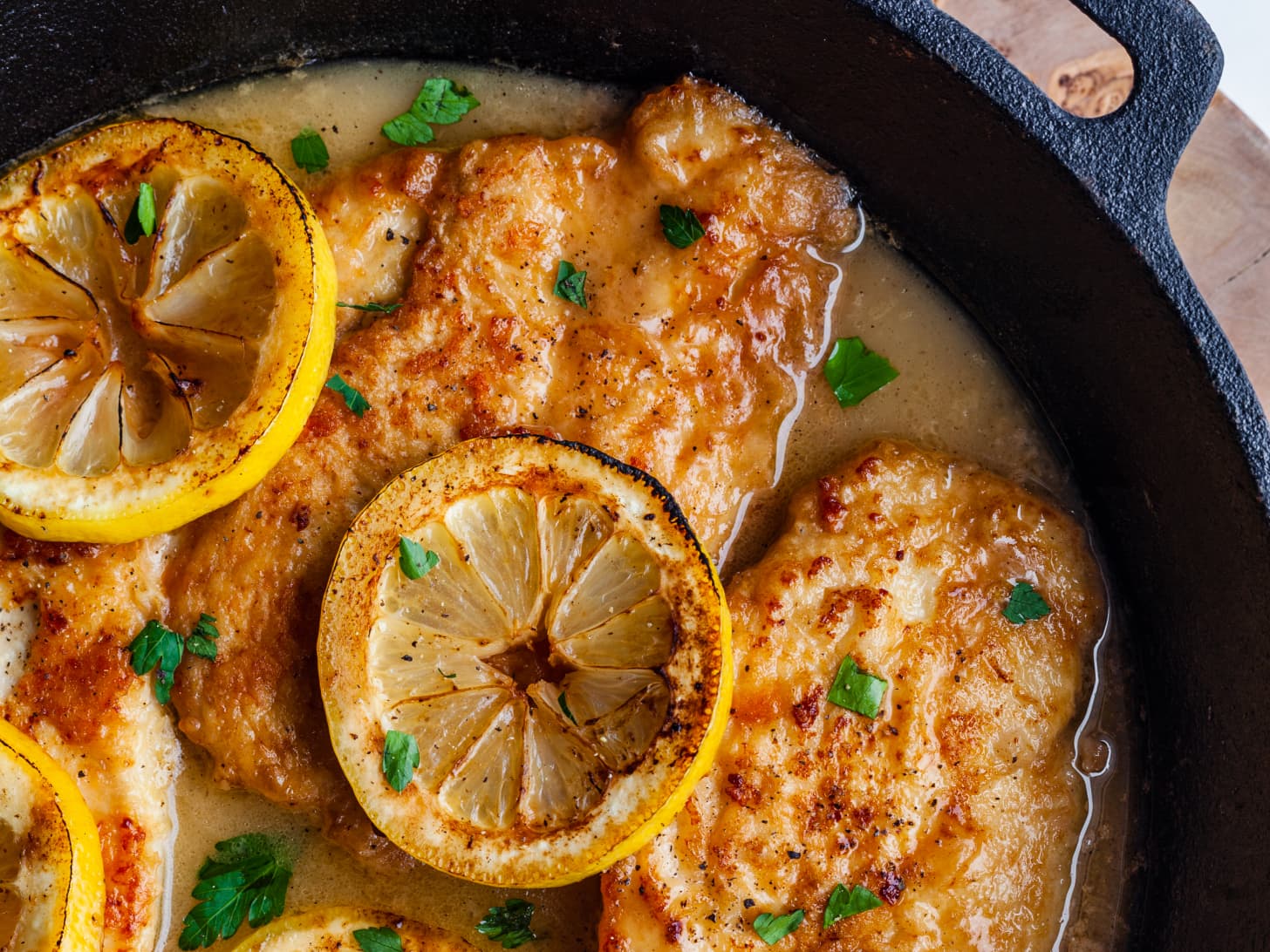 Pour out the oil and add lemon slices to the skillet. Cook for 30 seconds. Add wine, broth, lemon juice, and salt. Let simmer for 5 minutes.