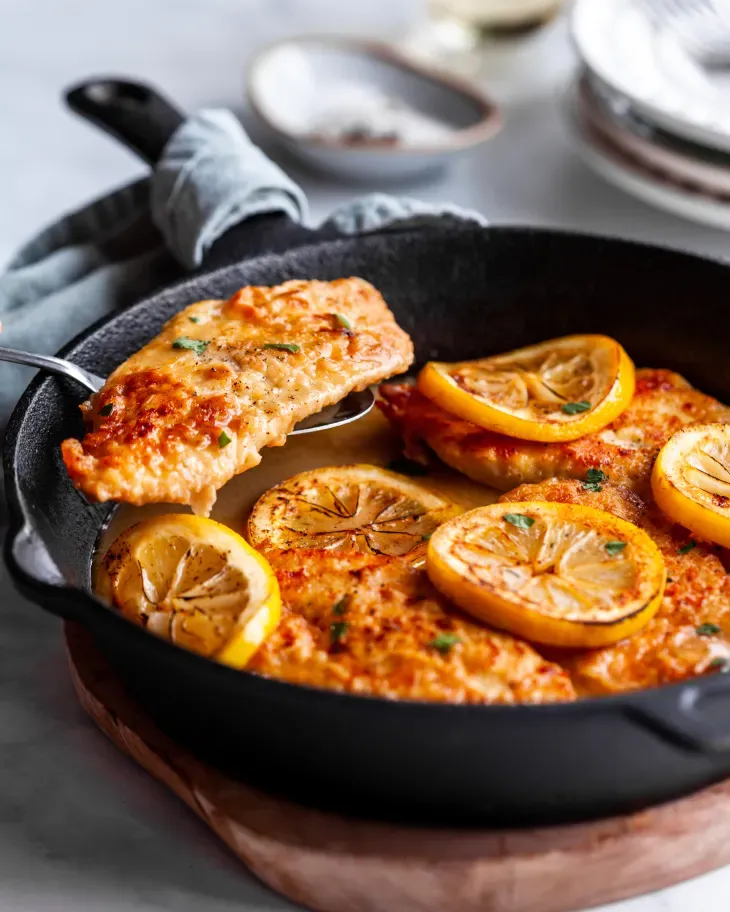 The recipe is quick and easy. You coat the chicken in flour and egg, then fry it until golden. Next, you make a sauce with lemon, wine, and broth. It’s a yummy meal that’s perfect for busy weeknights.