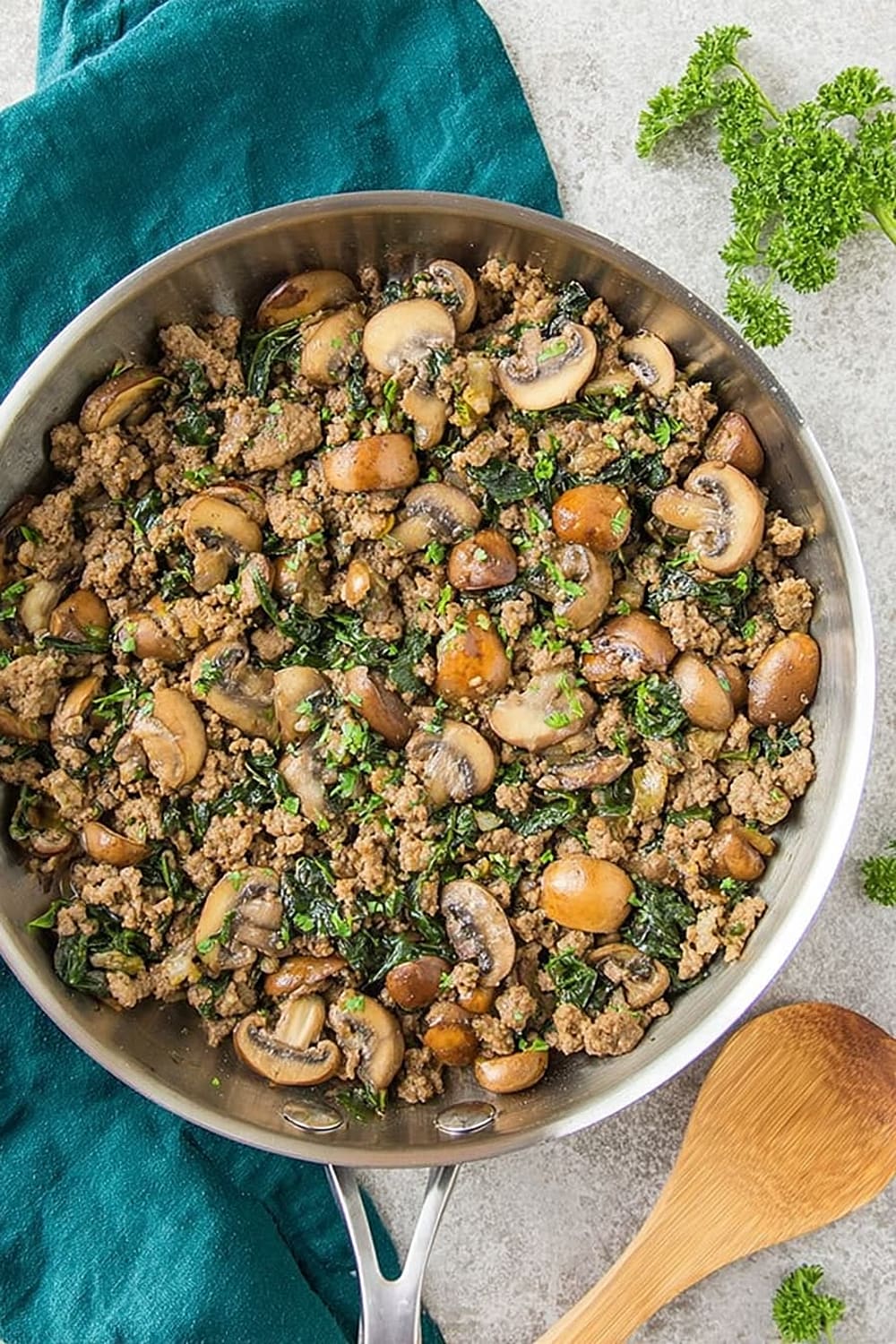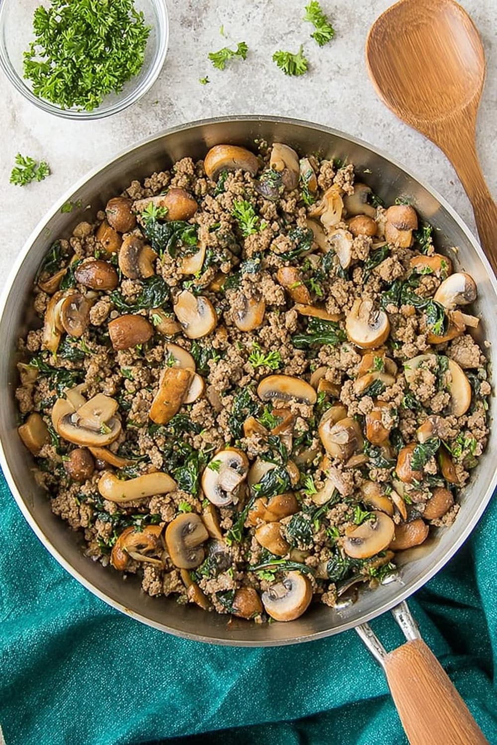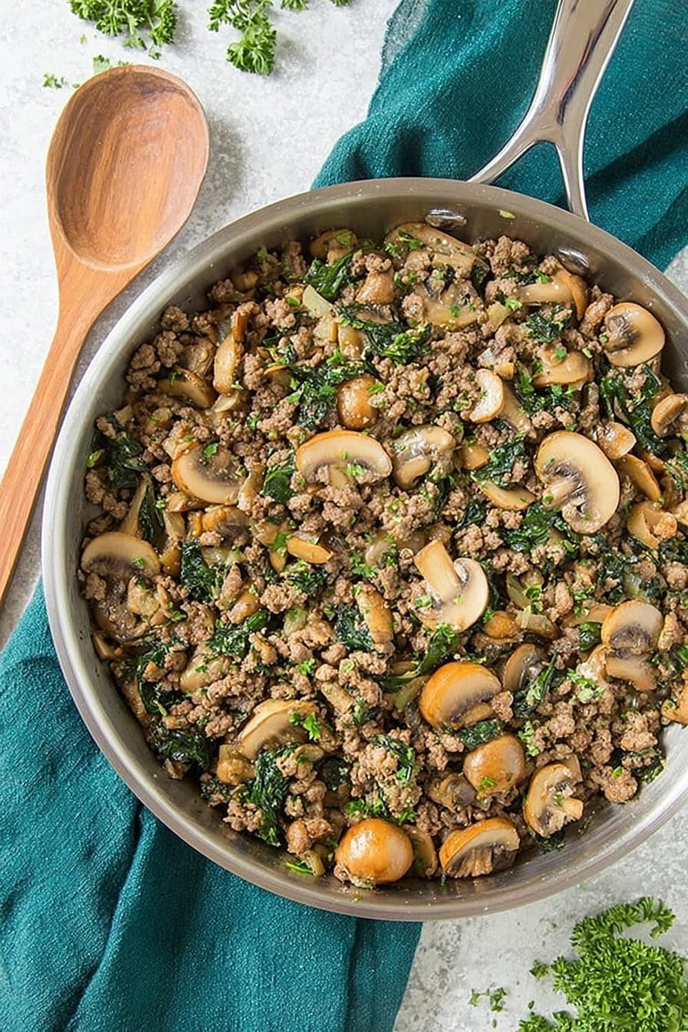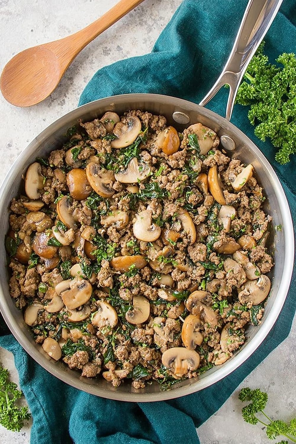 Picture this: savory ground beef mingling with earthy mushrooms while caramelized onions add their sweet magic to the party, all happening in one glorious cast iron skillet.
