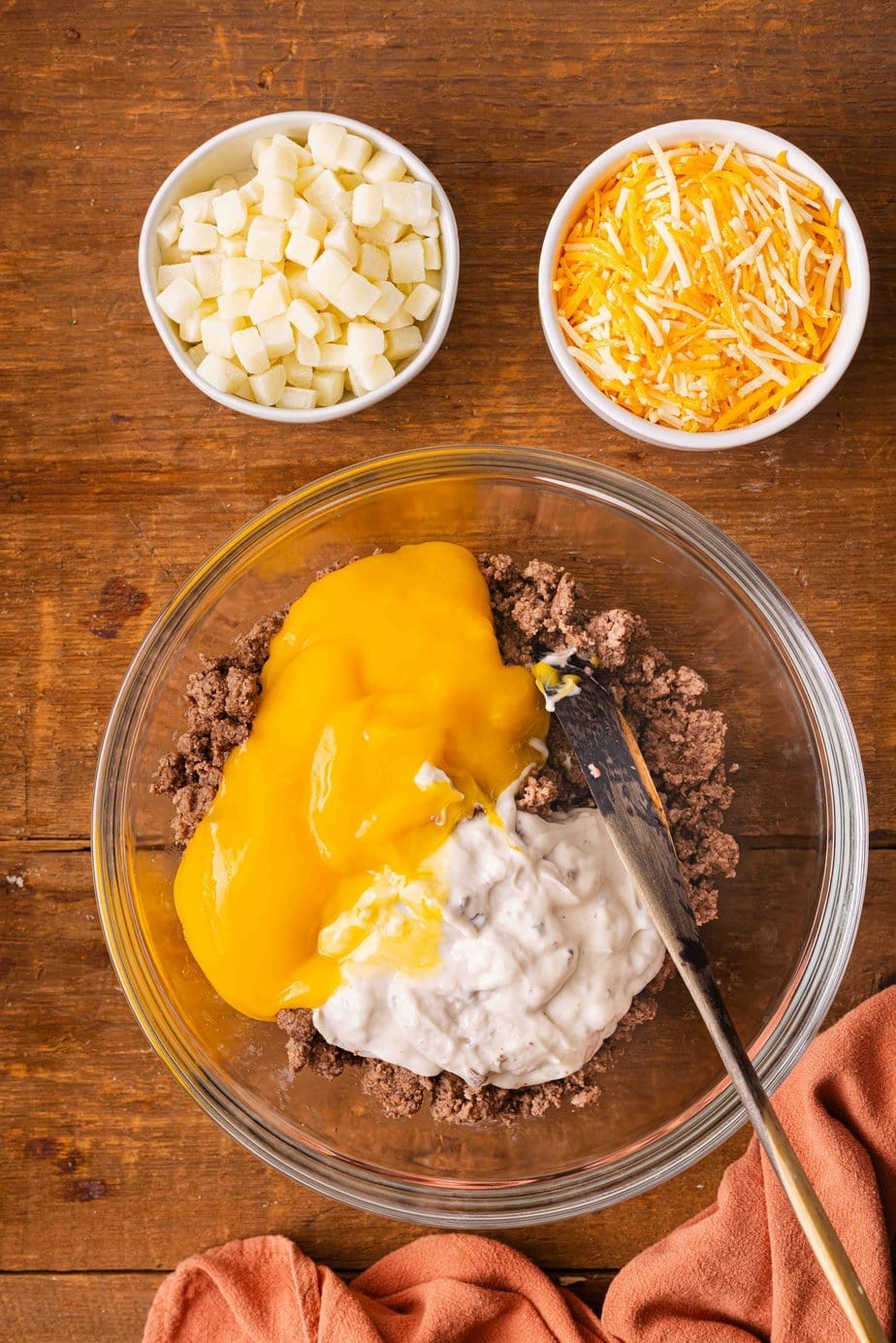 Toss in the frozen potato cubes and half a cup of shredded cheese. The potatoes add substance, while the cheese brings extra tastiness.