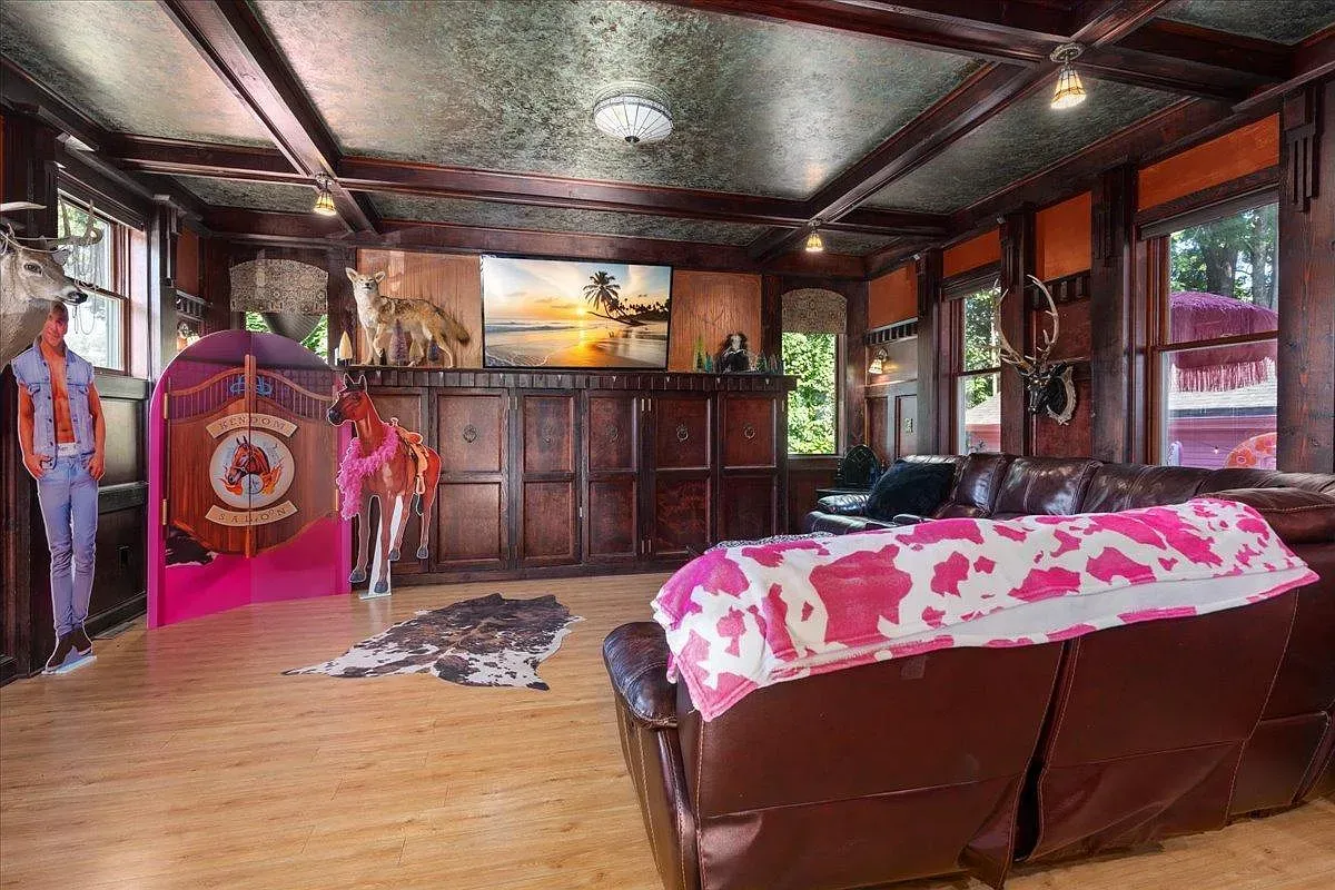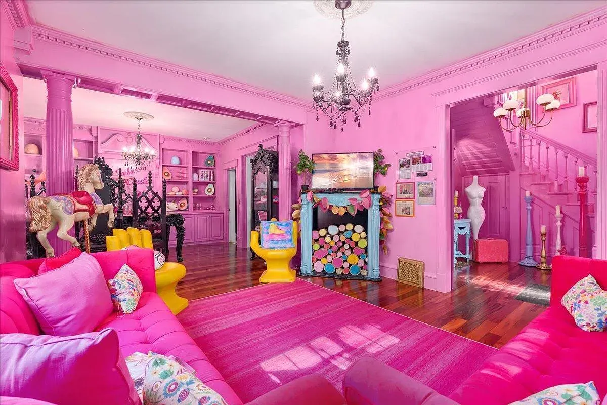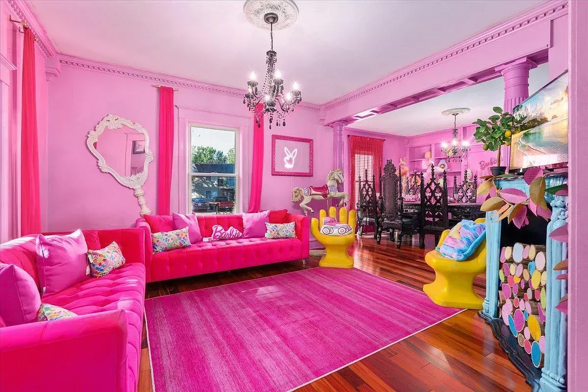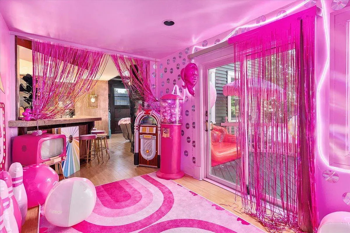 Welcome to the fun zone! This room is all decked out in pink, with a retro jukebox in the corner and some funky decorations. It’s perfect for hanging out or hosting friends. Just look at those charming touches and the bright vibes