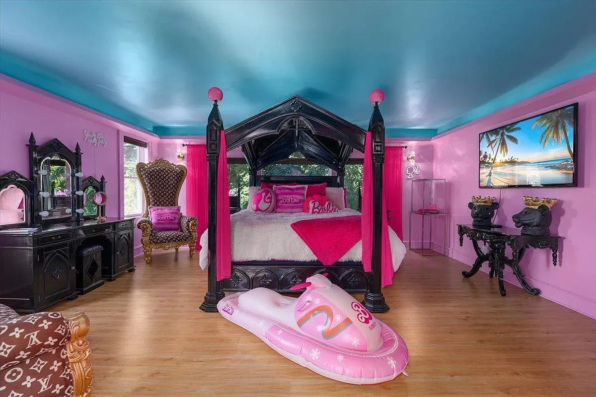 Welcome to this totally unique pink bedroom! It has a fun four-poster bed and a playful vibe that’s hard to miss. Plus, how about that adorable inflatable flamingo? It definitely adds a quirky touch!