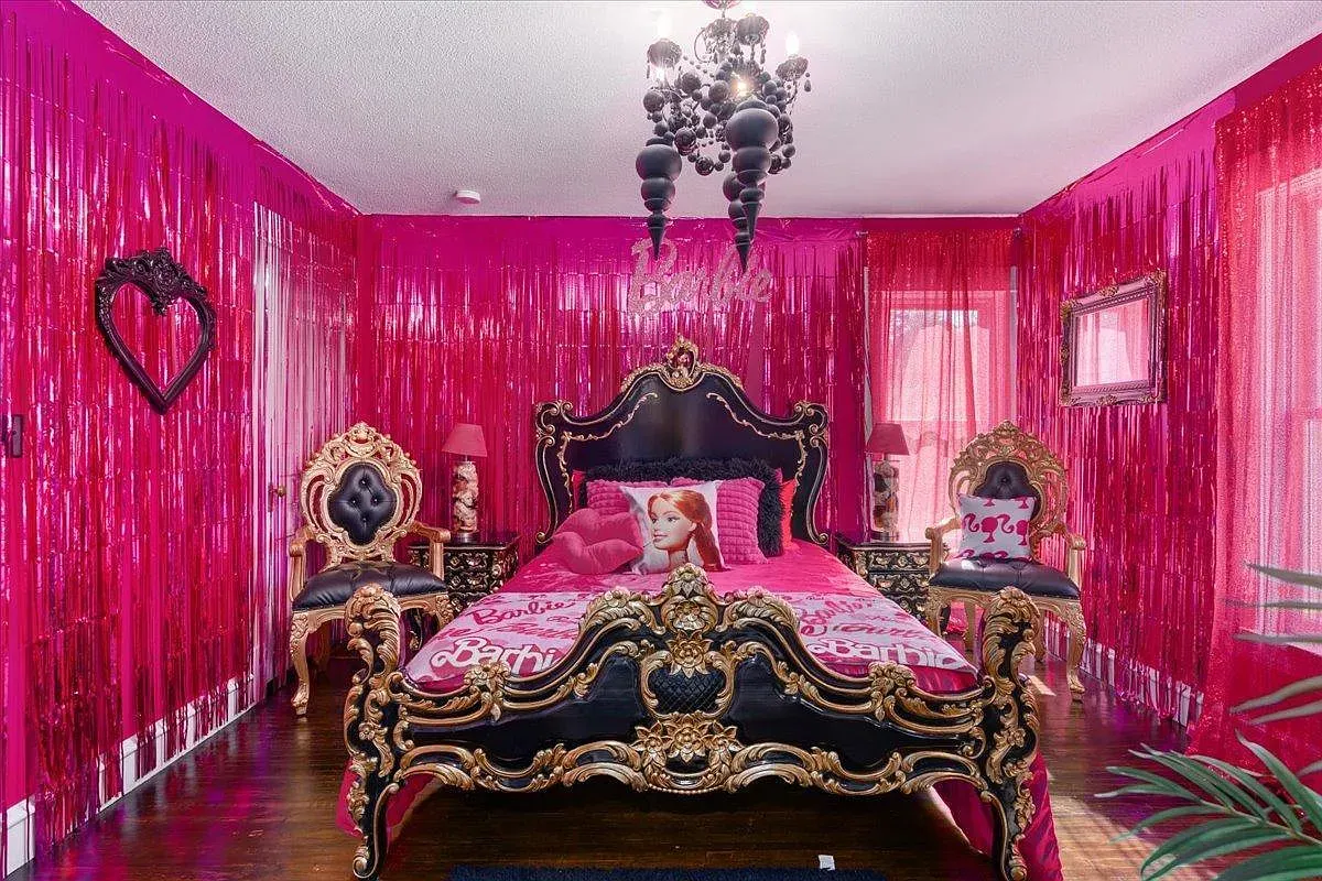Welcome to the fun and vibrant bedroom! The pink accents really pop, and the bed has this amazing vintage frame that adds a unique touch. It’s definitely not your everyday room!