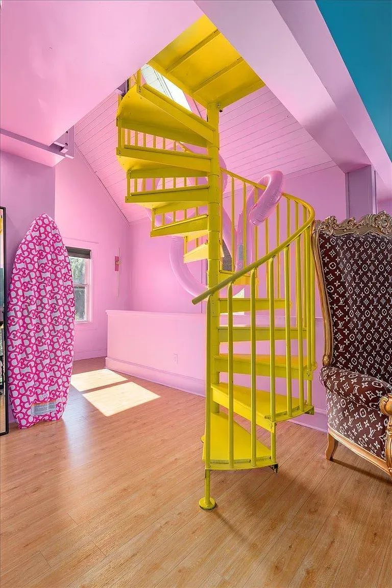Take a look at this fun spiral staircase—it’s bright yellow and really adds a pop of color to the space! Perfect for exploring the upper floor. Oh, and that pink surfboard leaning against the wall? Such a quirky touch!