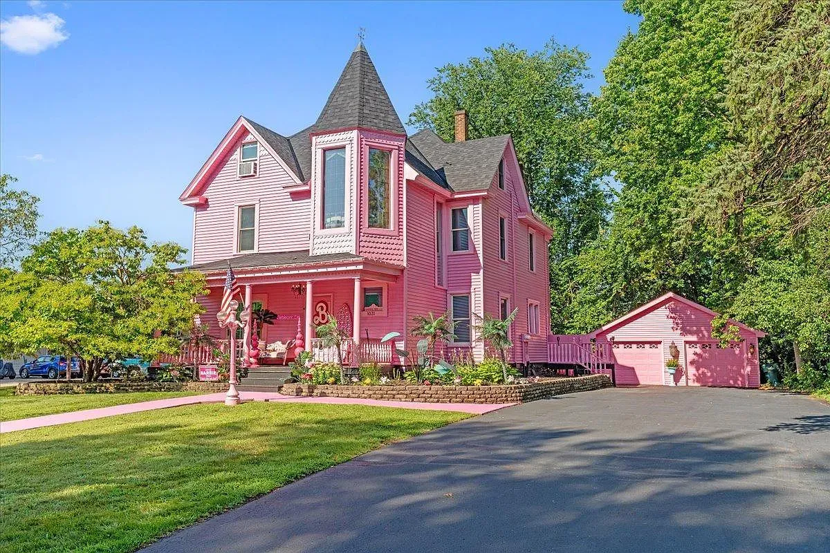 Isn’t this pink Victorian just charming? The turret gives it such a unique touch, and the landscaping adds a lot of character. Plus, there’s a cute garage right beside it!