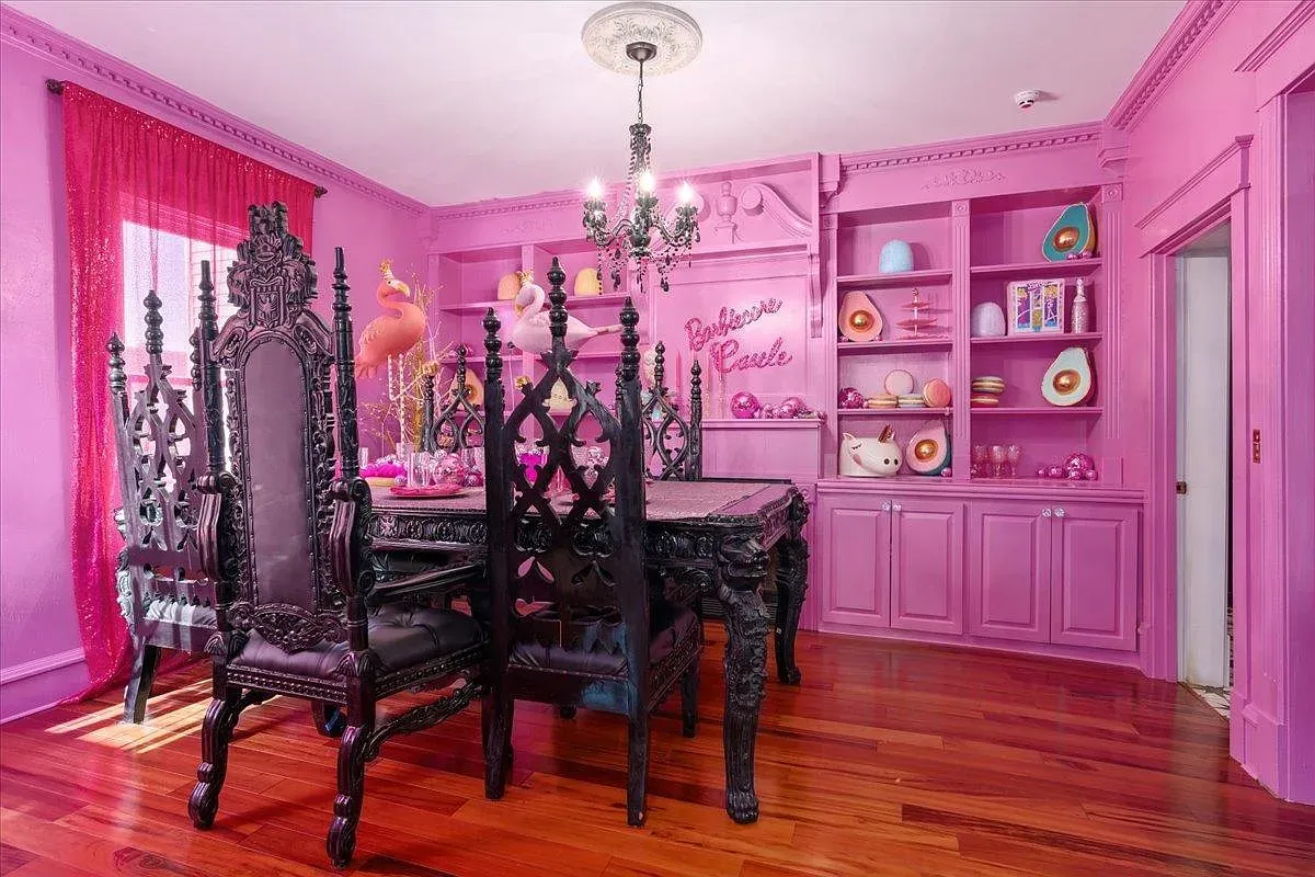 Welcome to the dining room! It’s got this playful pink vibe with those really unique chairs that just steal the show. I adore how the shelves are filled with fun decor and cute touches. Perfect for game nights or just gathering with friends!