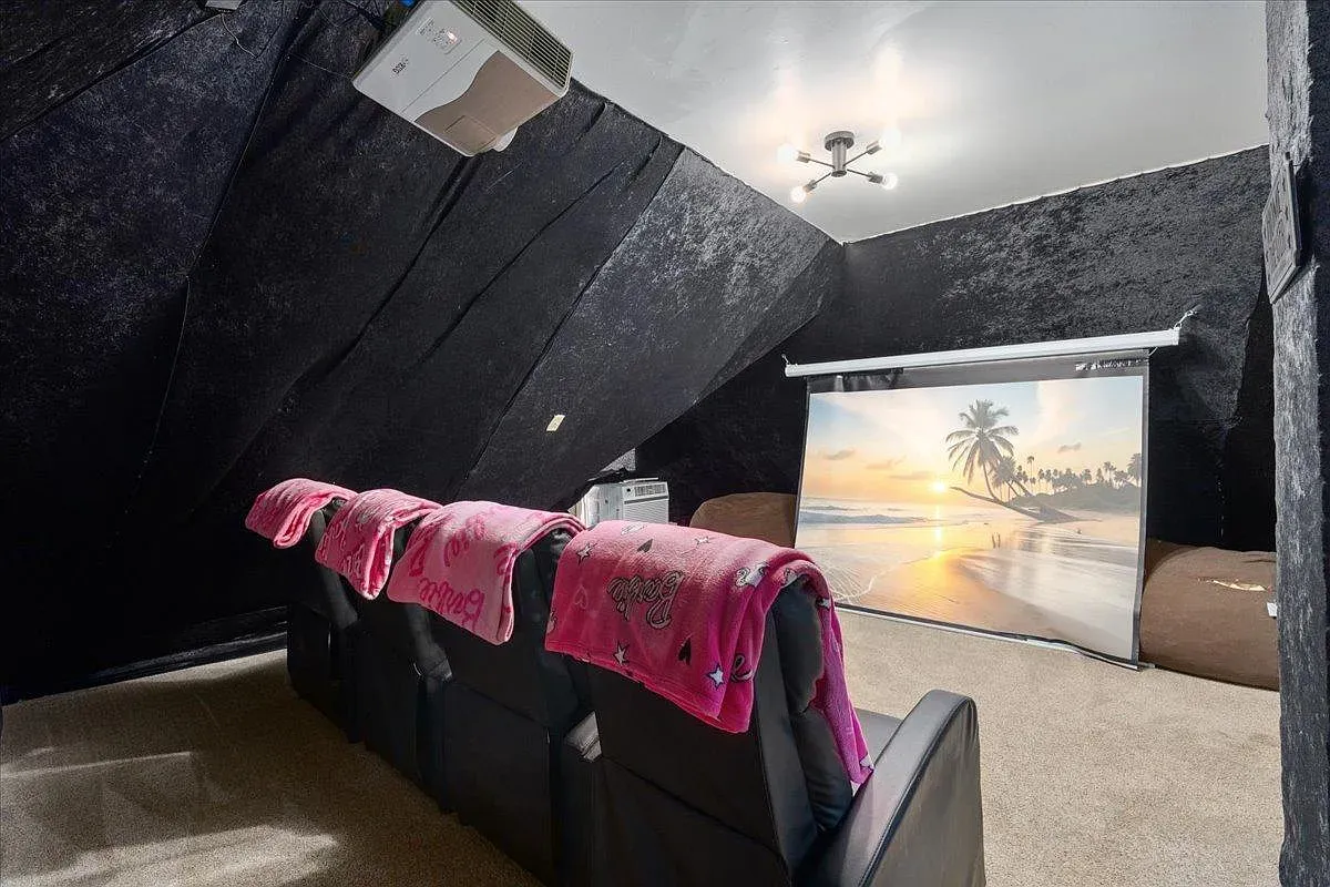 Welcome to the cozy home theater! It’s got a great setup for movie nights with comfy seating and a huge screen—perfect for curling up with some blankets and enjoying your favorite films.