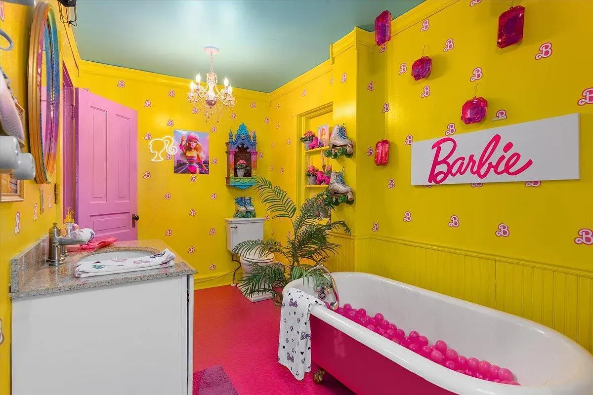 Isn’t this bathroom just a blast? The bright yellow walls totally pop, and I love the quirky décor, especially that retro bathtub filled with pink balls! It definitely has a fun, playful vibe.