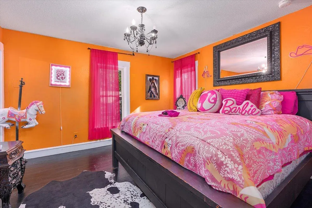 Welcome to the vibrant guest room! The orange walls give it such a fun energy, and that chandelier really adds character. The bed is super comfy, and I love how the Barbie-themed decor brings a playful touch. Plus, that cute little horse