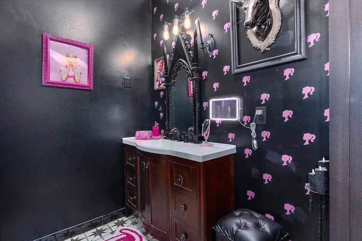 This bathroom has such a fun vibe with its bold black walls and playful pink accents! The vintage-style vanity adds a nice touch, and you’ve got that unique wall art—definitely not your typical powder room!