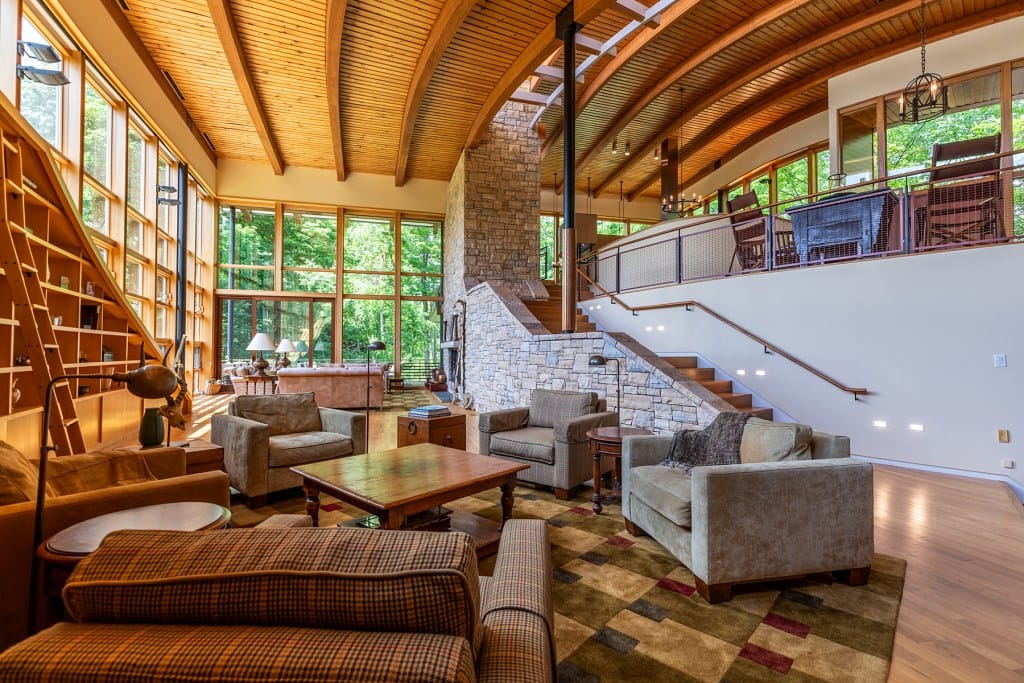 This luxurious mountaintop retreat, situated within Stratton Mountain Resort, offers stunning views of Stratton, Mt. Snow, and Bromley. The architectural masterpiece seamlessly blends comfort and elegance, featuring multi-level interiors that harmonize living areas and en suite bedrooms. Inspired by the graceful arcs of skiing turns, the design incorporates a dramatic entryway leading to a spacious living room and library. An 18-foot stone fireplace and expansive windows flood the space with natural light and breathtaking views.