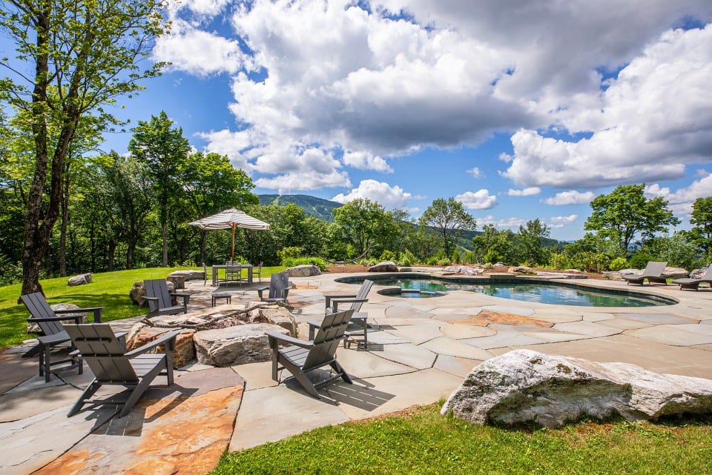 The gourmet kitchen, complete with a large eat-in dining area, flows into a formal dining room, perfect for entertaining. The home boasts six en suite bedrooms, including an expansive primary suite with an office, two custom walk-in closets, and a cedar closet. A custom-built bunk room with locker-style cubbies adds a touch of playful sophistication. A light-filled hallway connects the upper and lower levels, linking bedrooms, a home theater, and living areas, enhancing the open and airy feel. Additional amenities include a golf simulator and a movie theater. Outside, residents can enjoy mountain views, perennial gardens, natural stone accents, and bluestone walkways. In warmer months, the gunite pool and hot tub provide the perfect setting for relaxation. A gym in the detached three-car garage caters to fitness enthusiasts, while tennis and pickleball courts offer additional outdoor activities. This property is a true sanctuary where architectural elegance meets mountain tranquility, offering the epitome of luxury living.