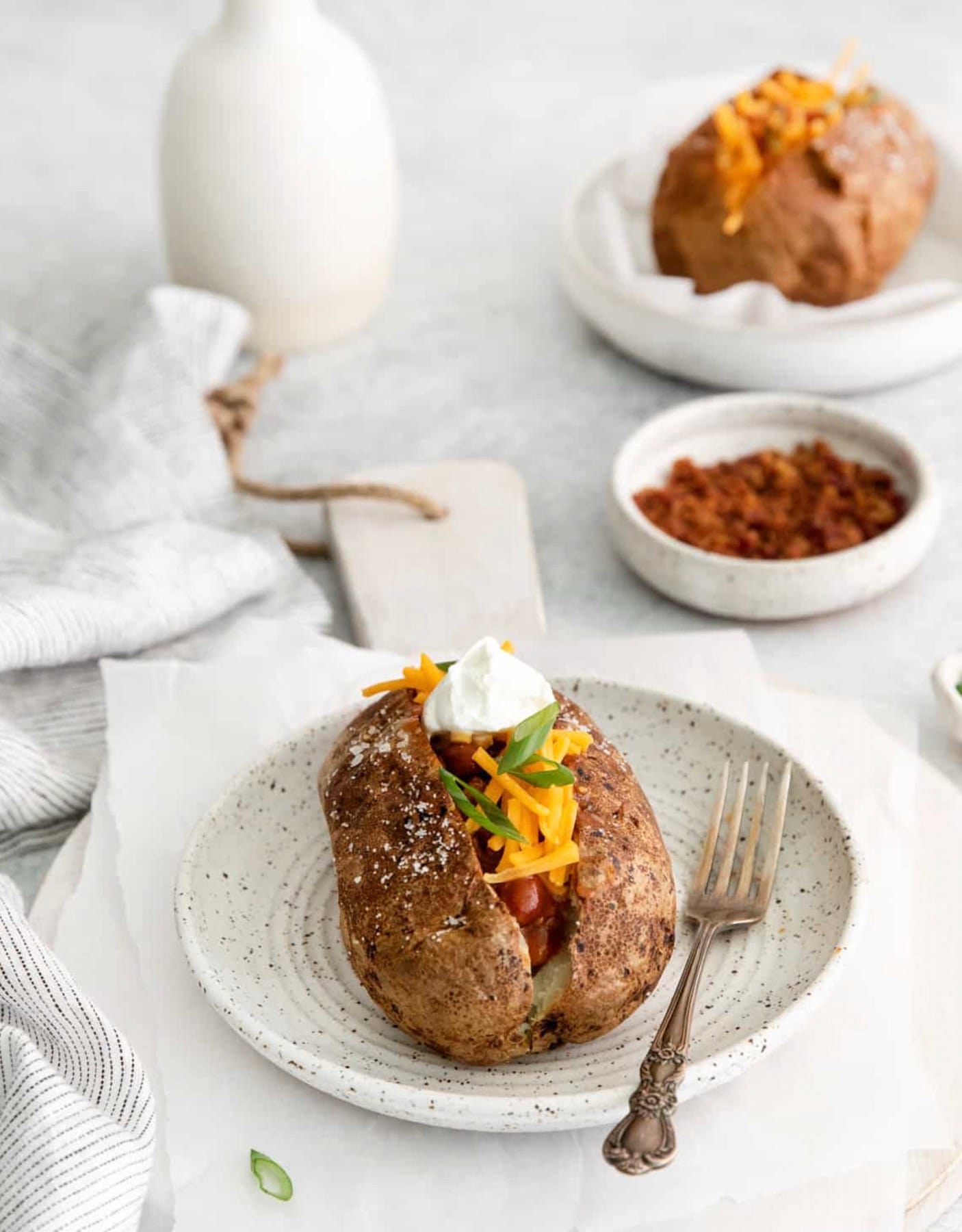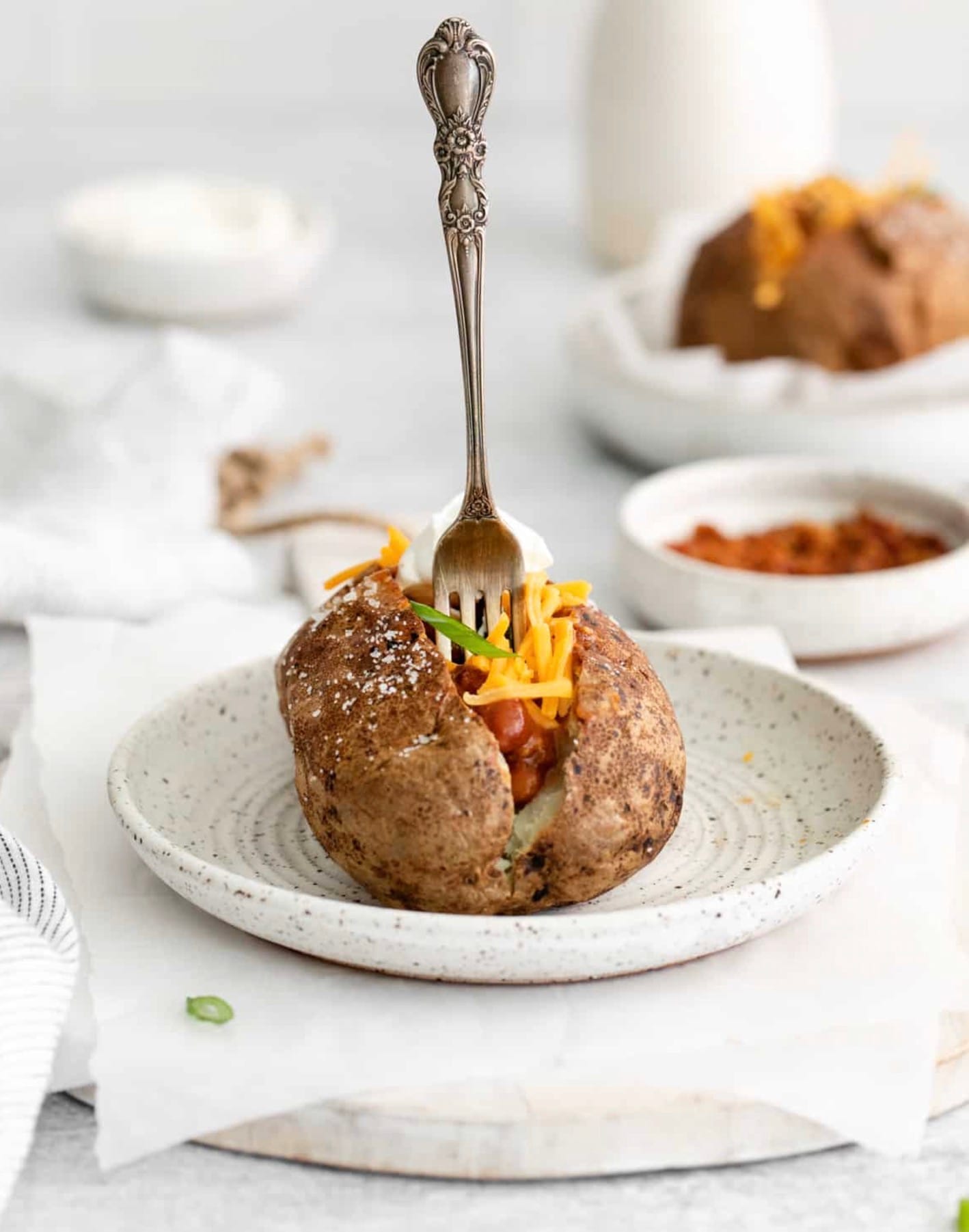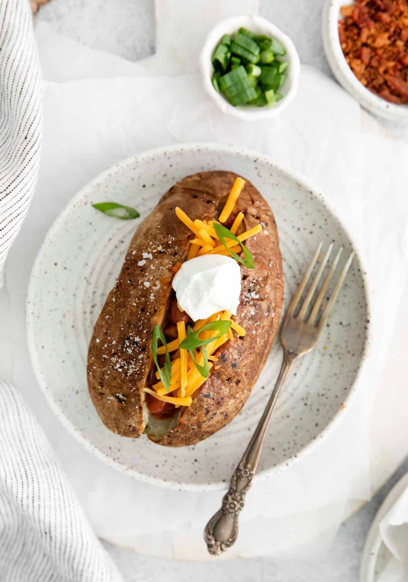 Pick your favorite toppings to make your baked potato just the way you like it. You can stick with classic butter and sour cream or load it up with cheese, bacon, and chili for a heartier meal.
