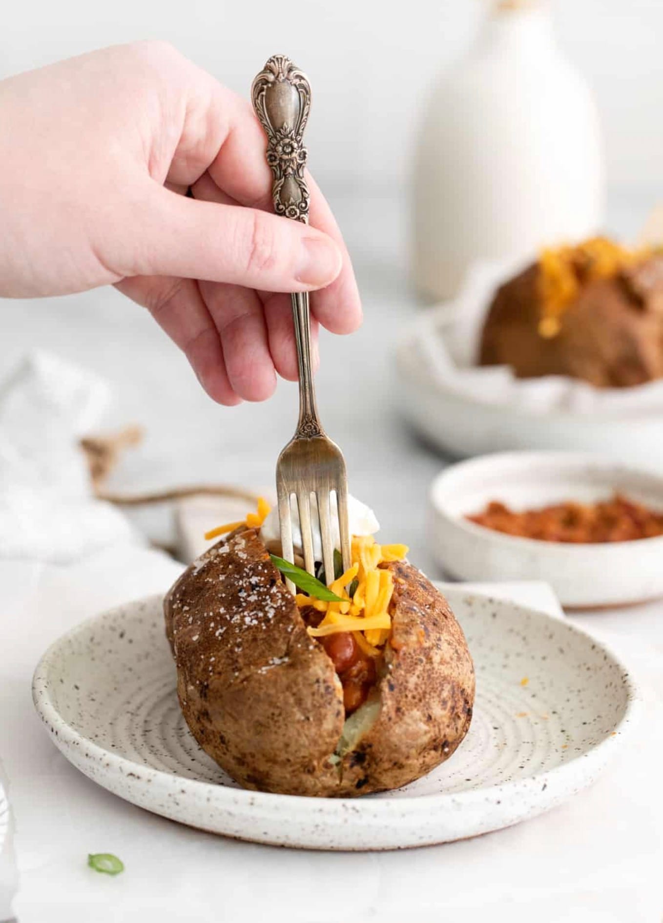 To make air fryer baked potatoes, you’ll need russet potatoes, olive oil, and kosher salt. Wash and dry the potatoes, poke them with a fork, then rub with oil and salt. Cook at 400°F for about 40 minutes, flipping halfway through. Top your potato with butter, sour cream, cheese, bacon, chili, or green onions for a tasty meal or side dish.