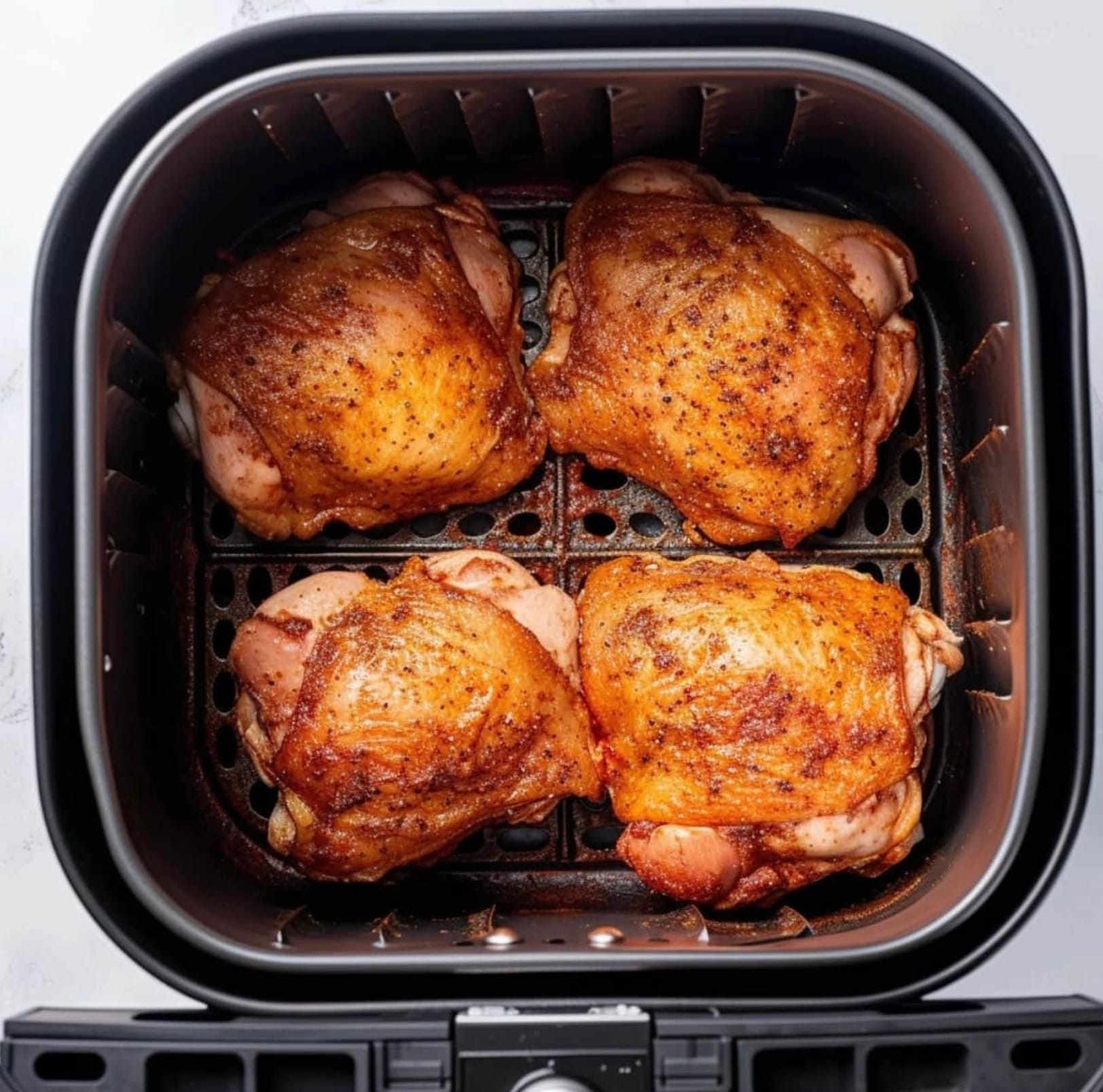 Place the seasoned thighs in your air fryer basket. Arrange them in a single layer, skin side down. Don’t overcrowd the basket.