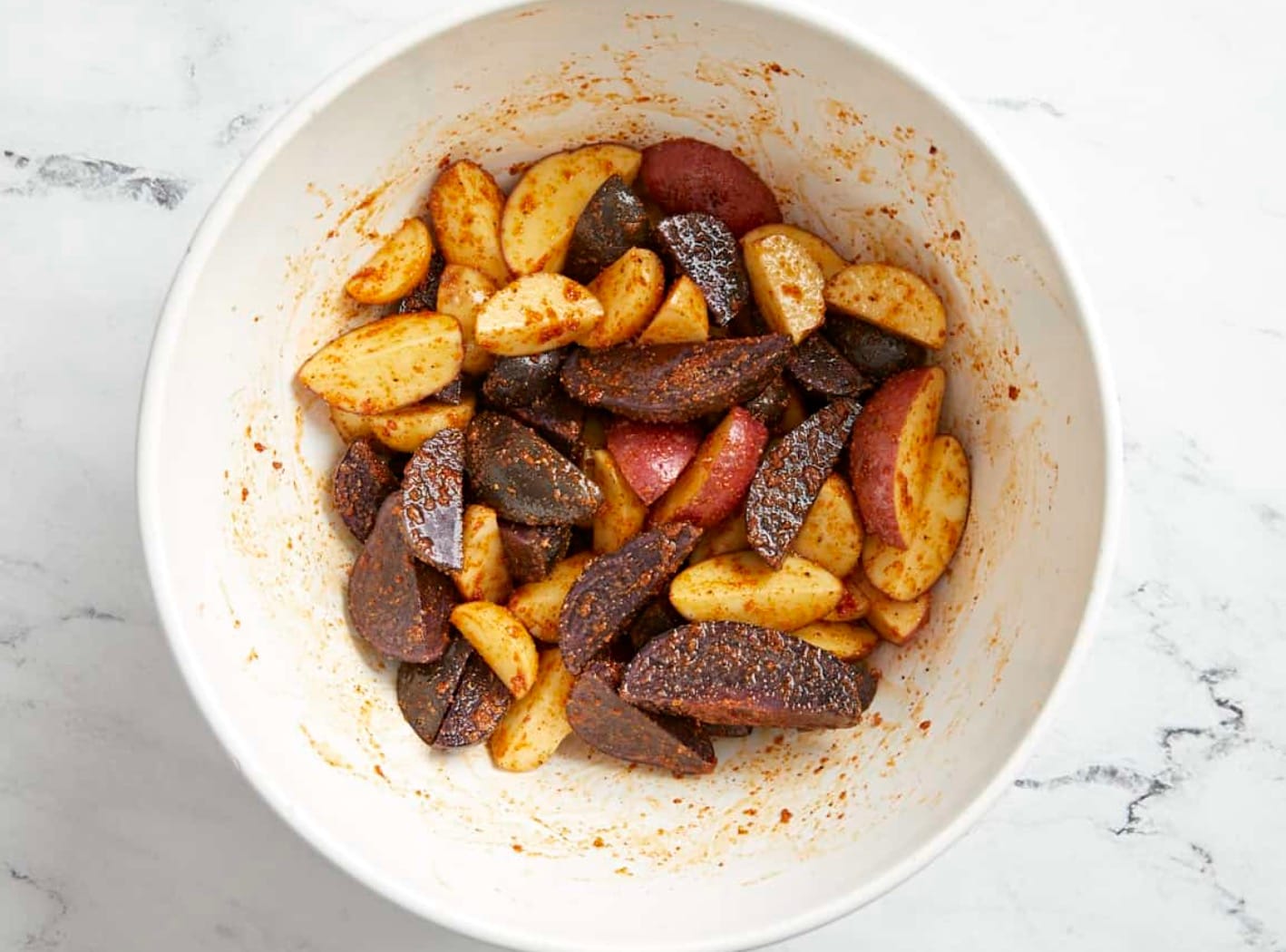 Put the potatoes in a big bowl. Pour 1/2 tablespoon of olive oil over them. Sprinkle on 1/2 teaspoon each of garlic powder, onion powder, and smoked paprika. Add a pinch of salt and pepper. Mix everything well so the potatoes are coated.