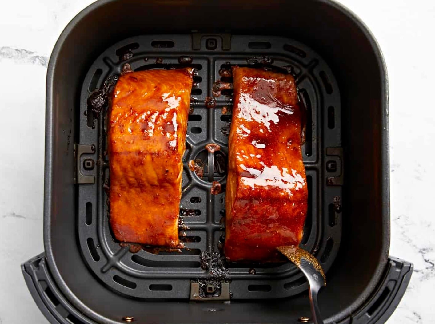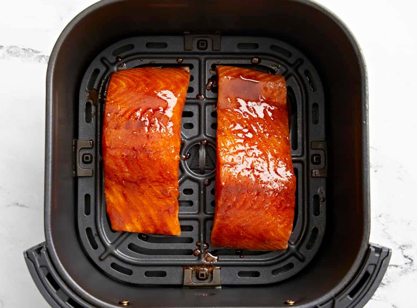 To make air fryer salmon, you’ll need Atlantic salmon, soy sauce, brown sugar, black pepper, and garlic powder. Mix the sauce, coat the fish, and cook it in the air fryer at 400°F for about 8 minutes. The brown sugar in the marinade will caramelize, giving your salmon a nice color and flavor.