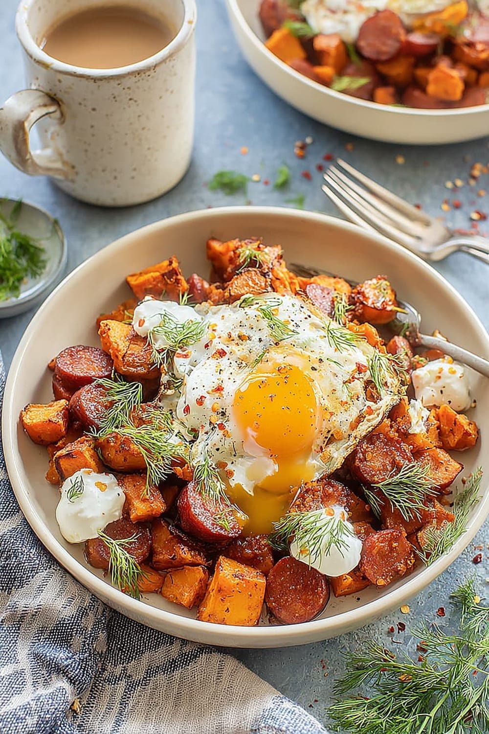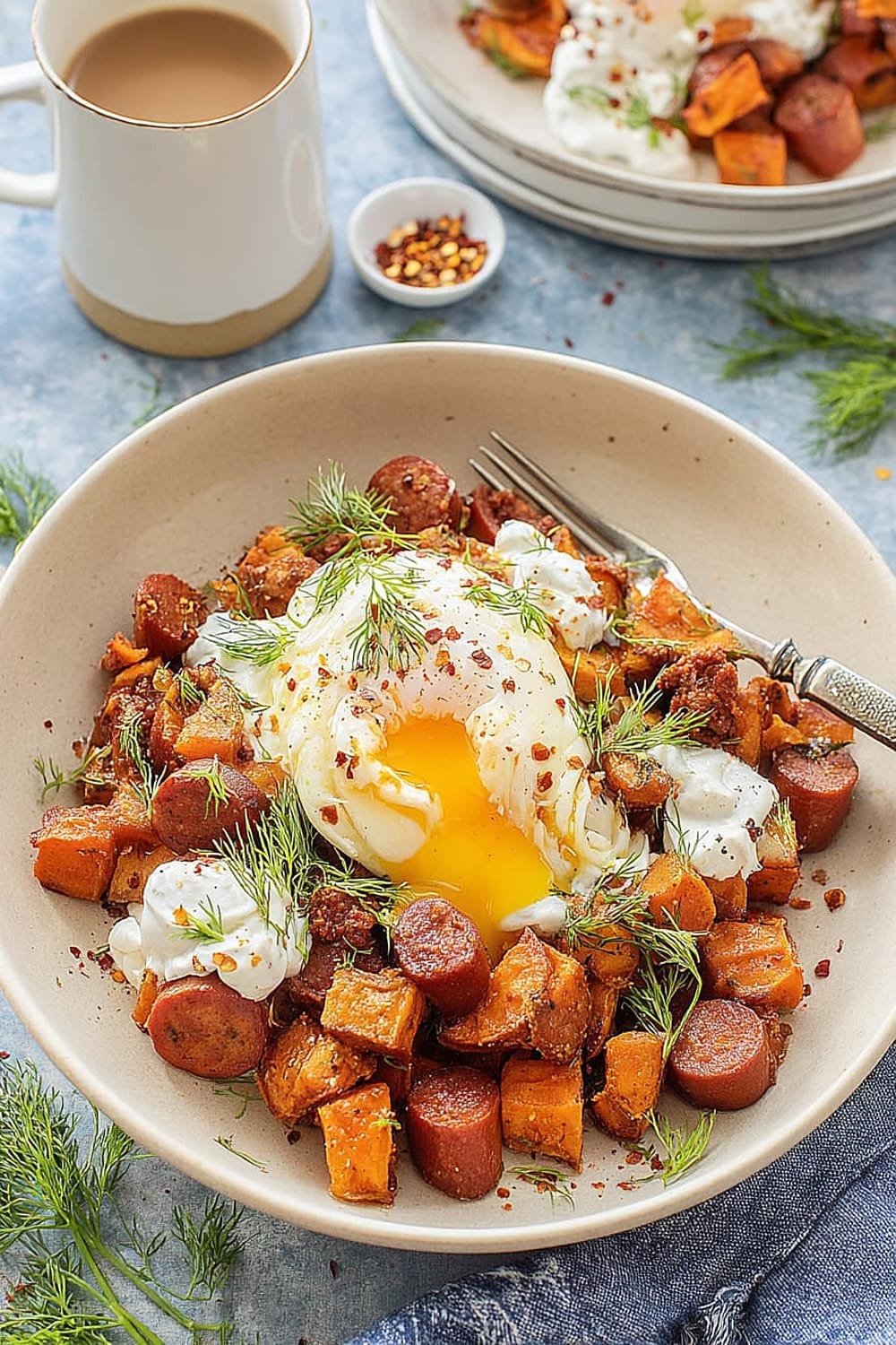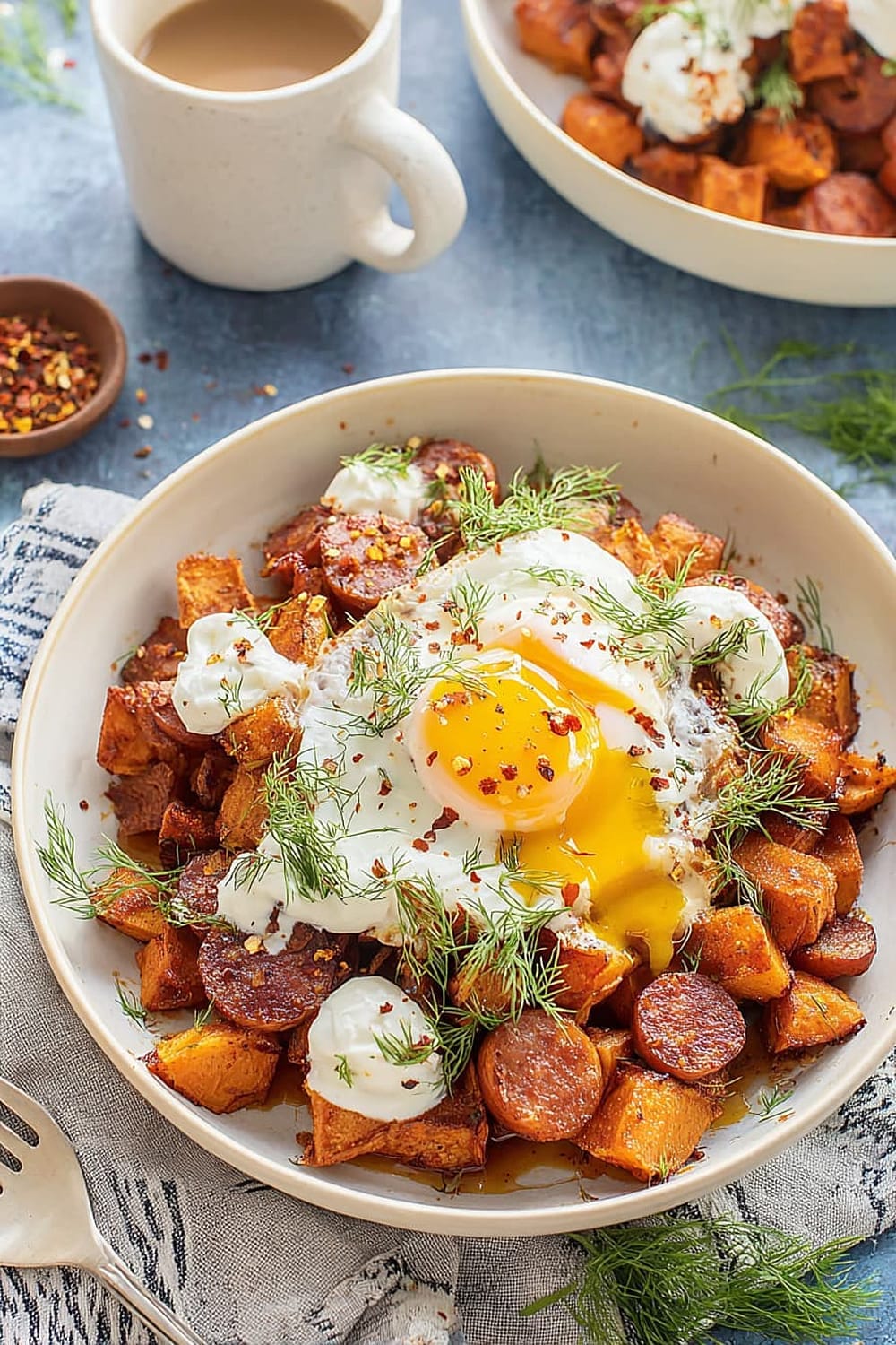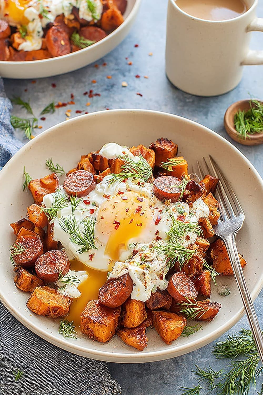 - 7 Transfer the hot sweet potato and chorizo hash to serving plates. Drizzle generously with the seasoned Greek yogurt, then top with the aromatic garlic chili butter. Finish with a generous sprinkle of fresh dill for a pop of color and herbaceous freshness.
