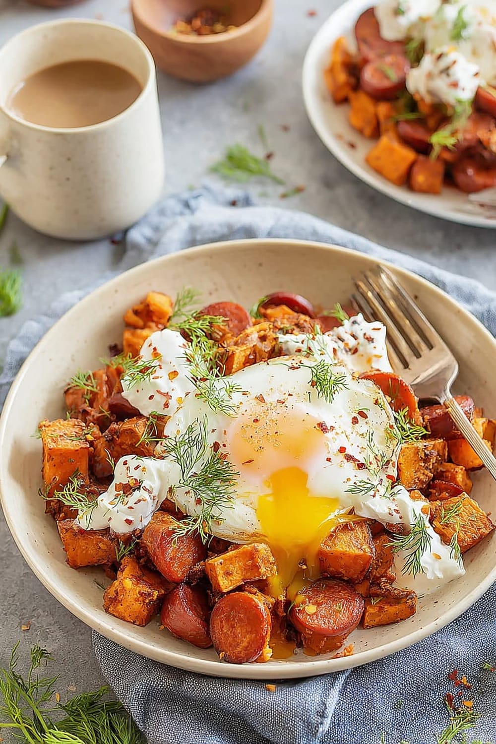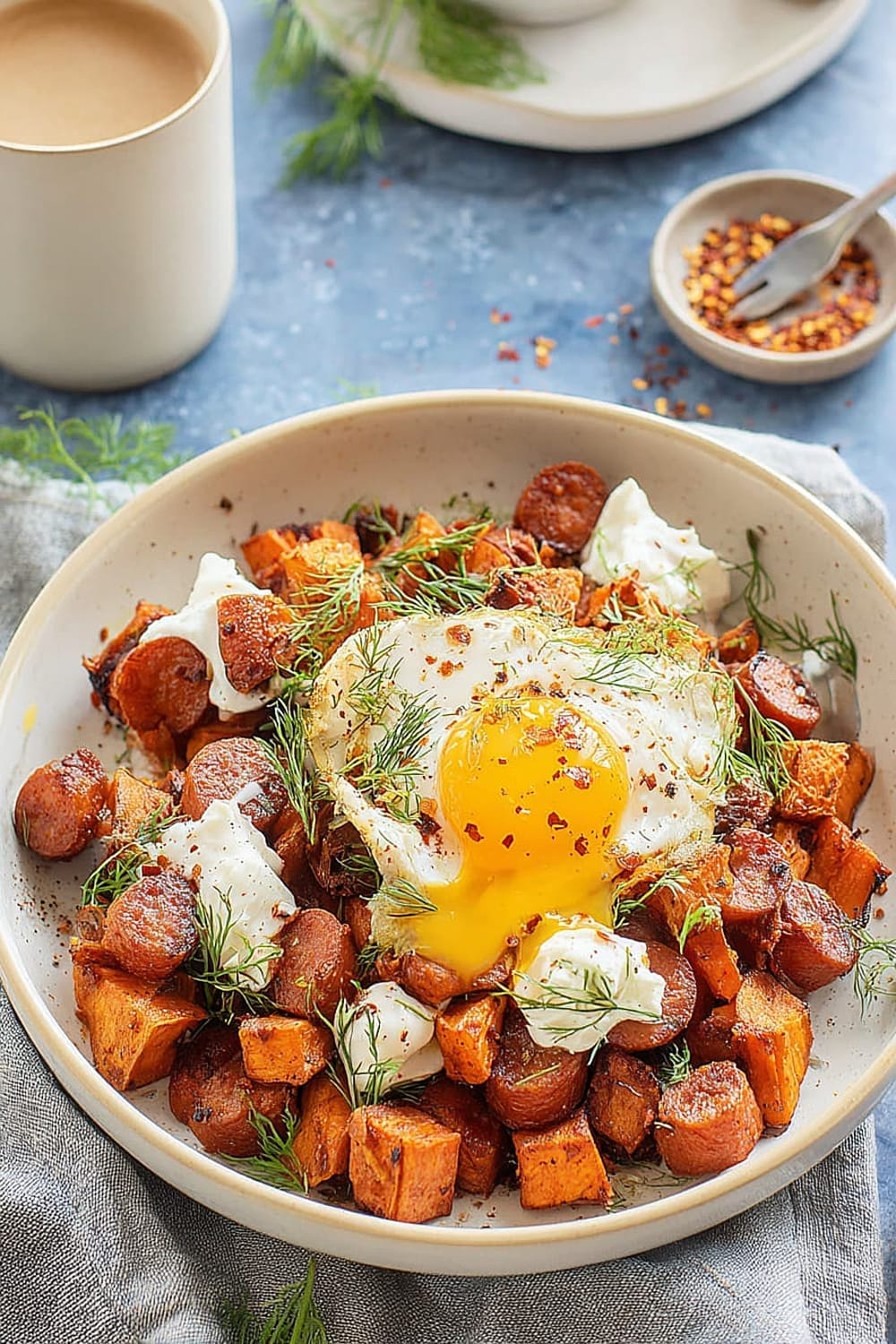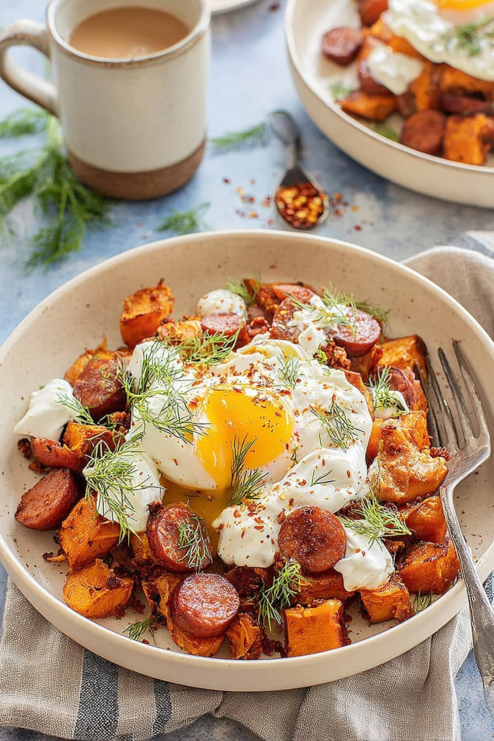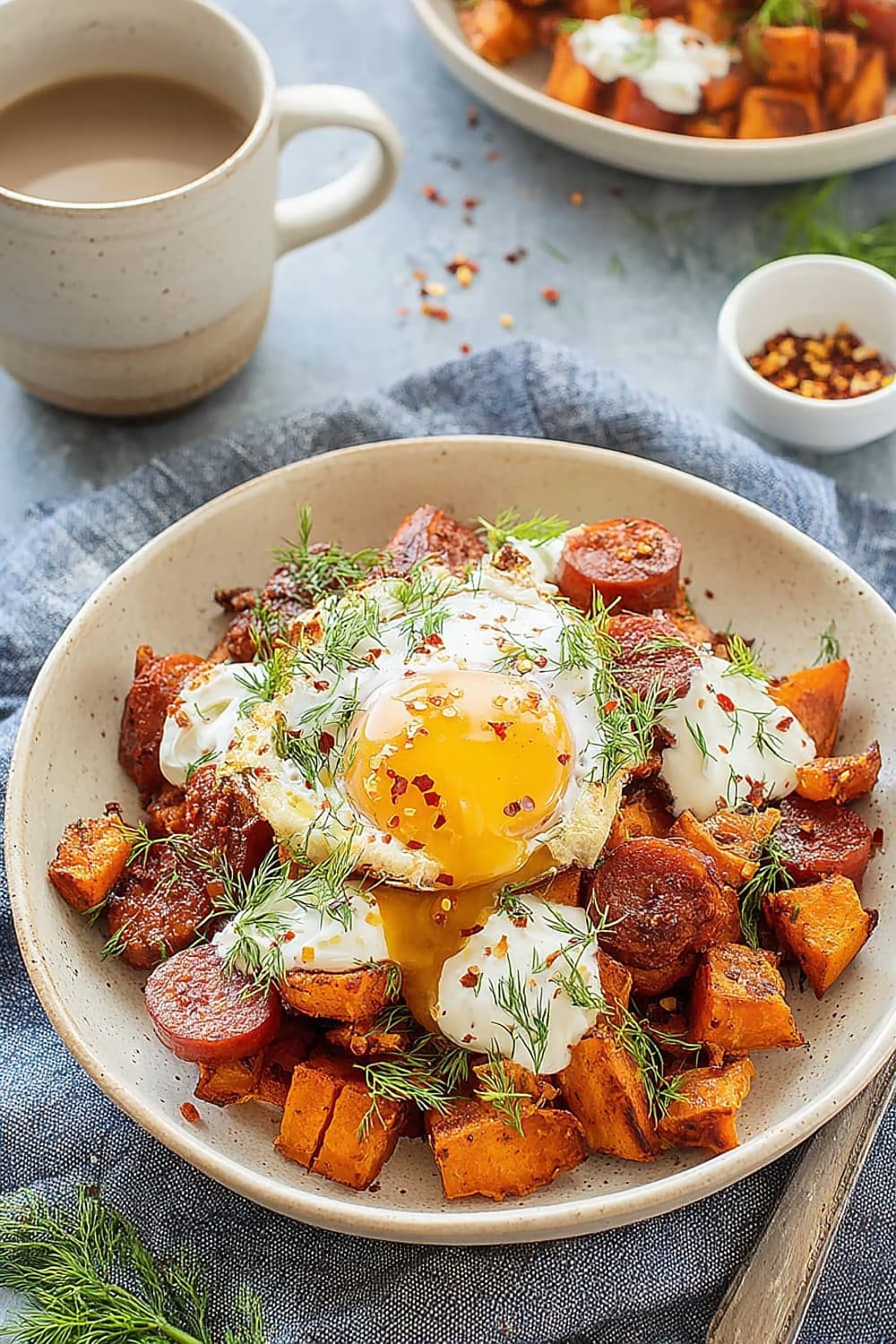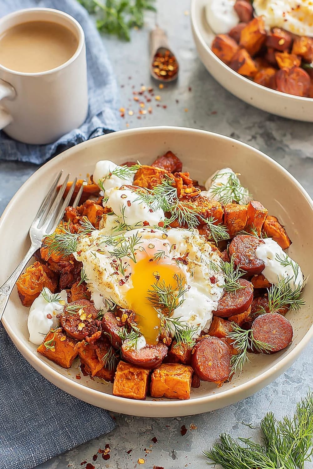 - 7 Transfer the hot sweet potato and chorizo hash to serving plates. Drizzle generously with the seasoned Greek yogurt, then top with the aromatic garlic chili butter. Finish with a generous sprinkle of fresh dill for a pop of color and herbaceous freshness.