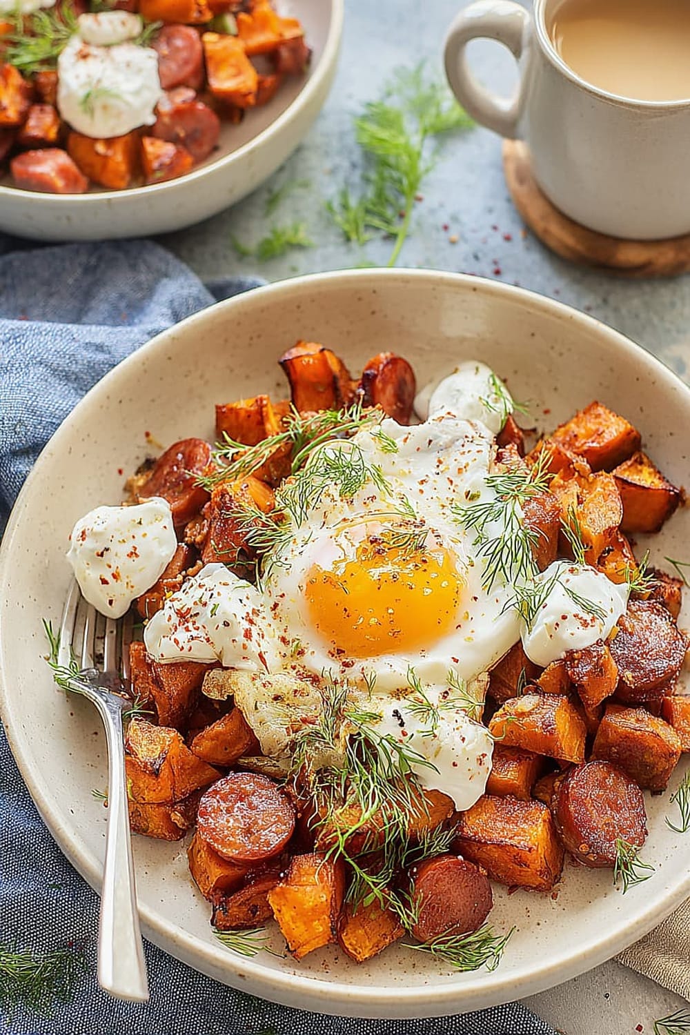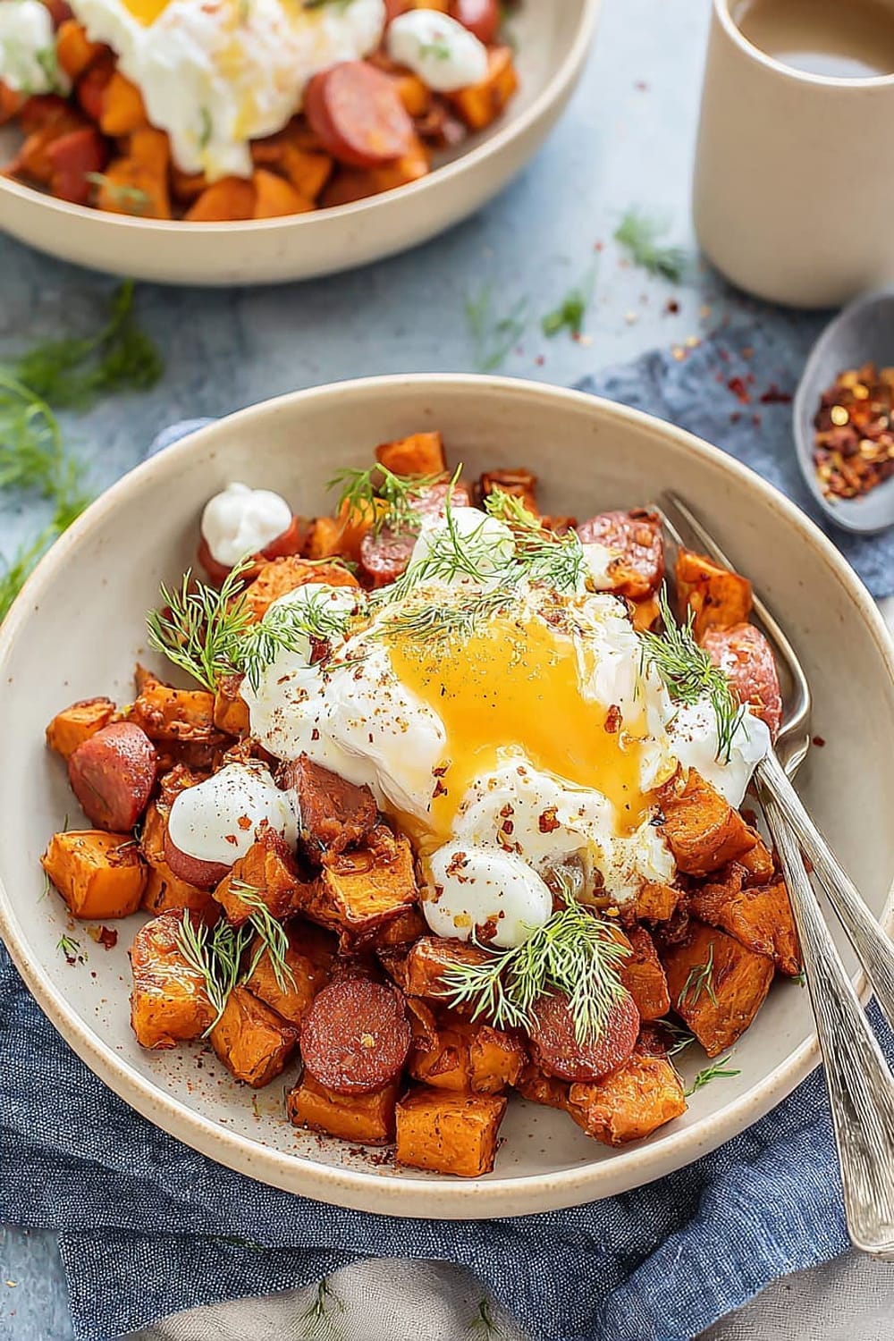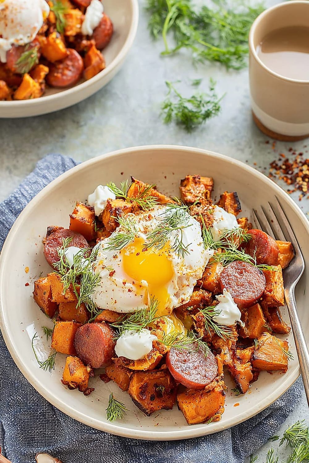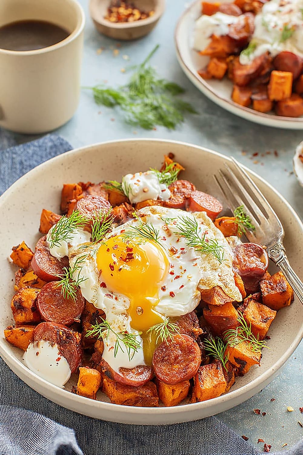 - 7 Transfer the hot sweet potato and chorizo hash to serving plates. Drizzle generously with the seasoned Greek yogurt, then top with the aromatic garlic chili butter. Finish with a generous sprinkle of fresh dill for a pop of color and herbaceous freshness.