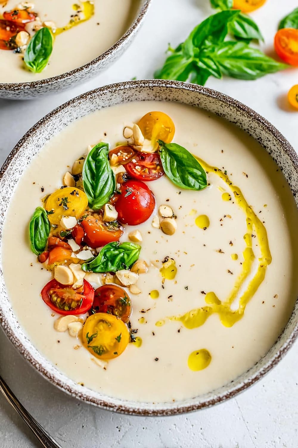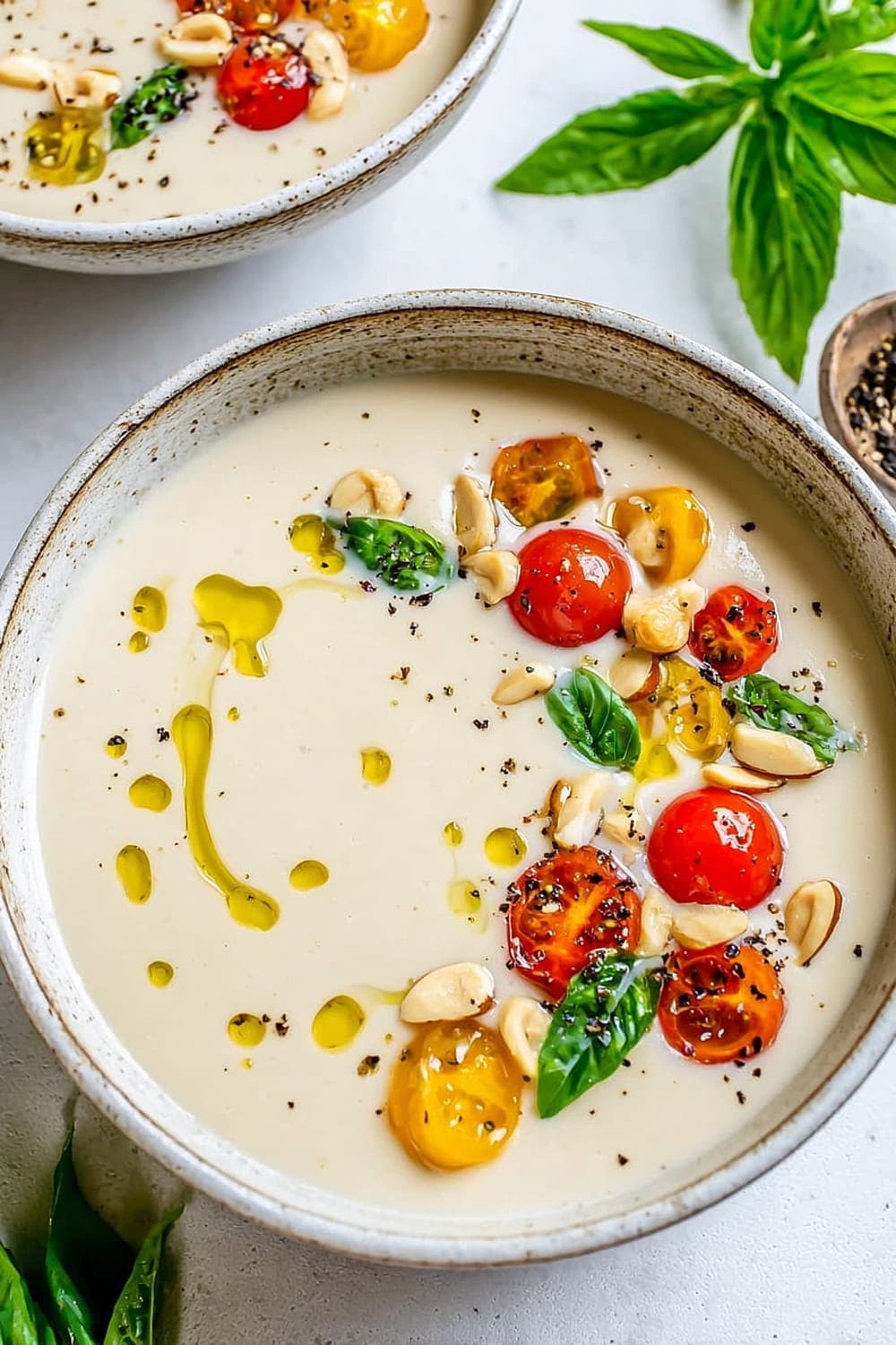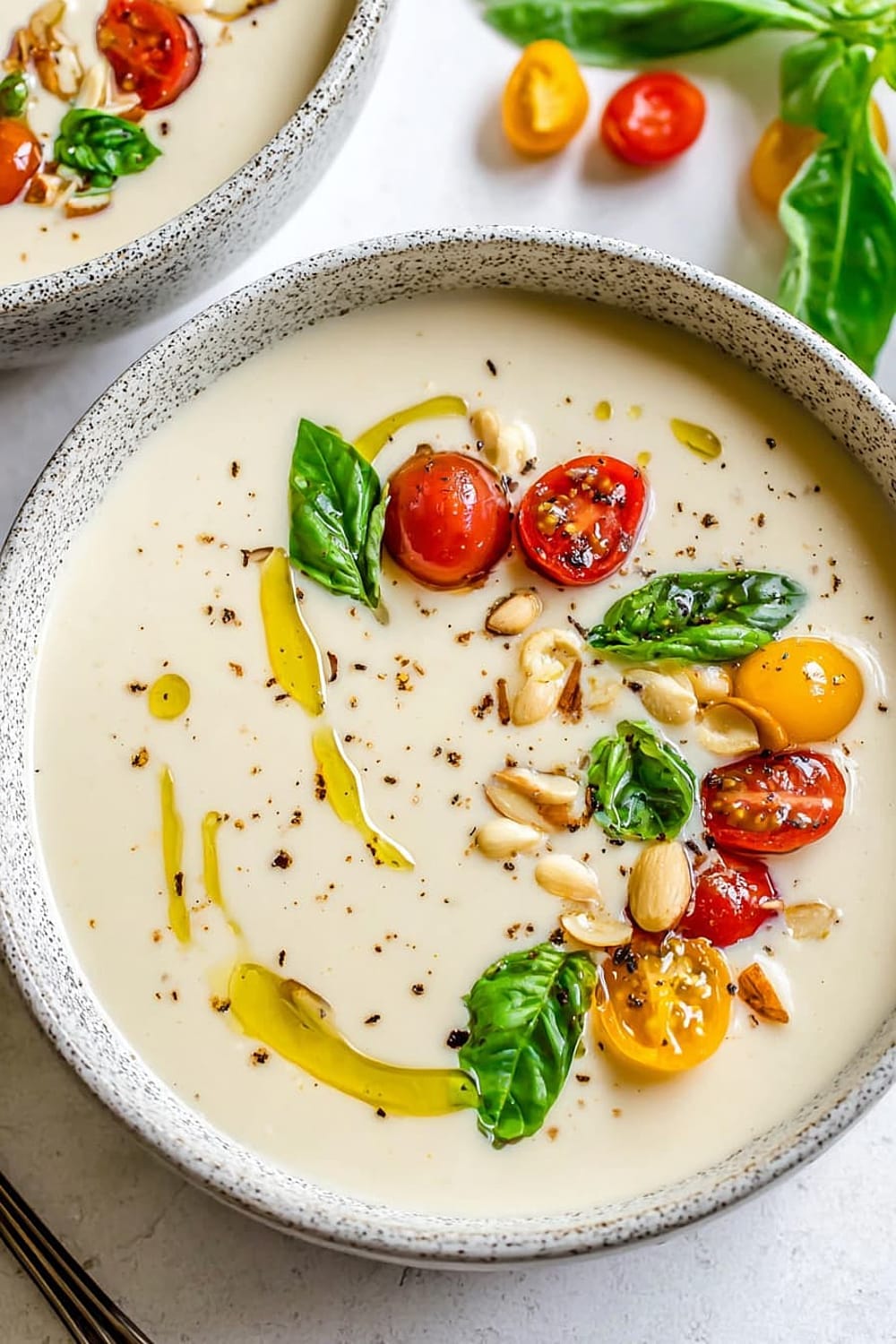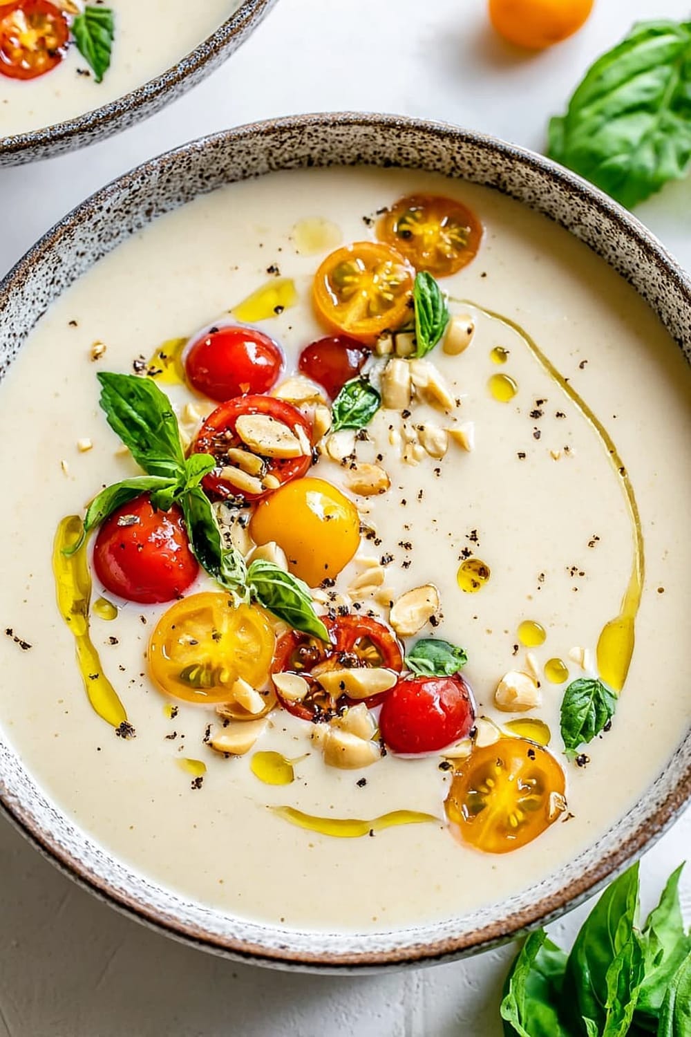 - 7 Pour the chilled ajo blanco into bowls and garnish with halved green grapes (traditional), grape tomatoes, or sliced fresh figs. Drizzle with additional extra-virgin olive oil and finish with a sprinkle of freshly cracked black pepper.