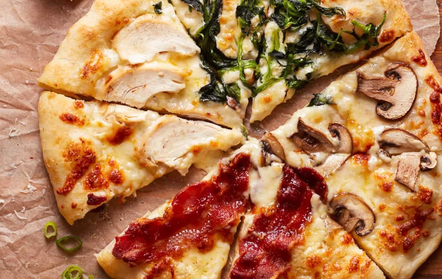 Mix and match these toppings to create your ideal Alfredo pizza. Remember not to overload your pizza – stick to about 2 cups of toppings total. Pre-cook raw meats and veggies to ensure they’re fully cooked when the pizza is done.