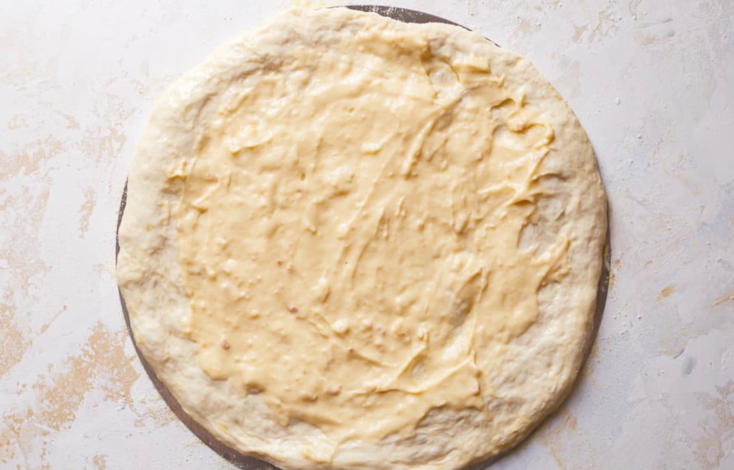 Shape the Pizza Dough: Preheat your oven to 500°F. If you have a pizza stone, let it preheat for about 30 minutes. Roll or gently stretch out 1 pound of pizza dough into a large circle. If you don’t have a pizza stone, place the stretched dough on a baking sheet lined with parchment paper. If you do have a pizza stone, lightly dust a pizza peel with semolina flour and place the stretched dough on it. Spoon ½ cup of Alfredo sauce on top of the pizza dough, spreading it generously while maintaining a 1-inch border around the edges.