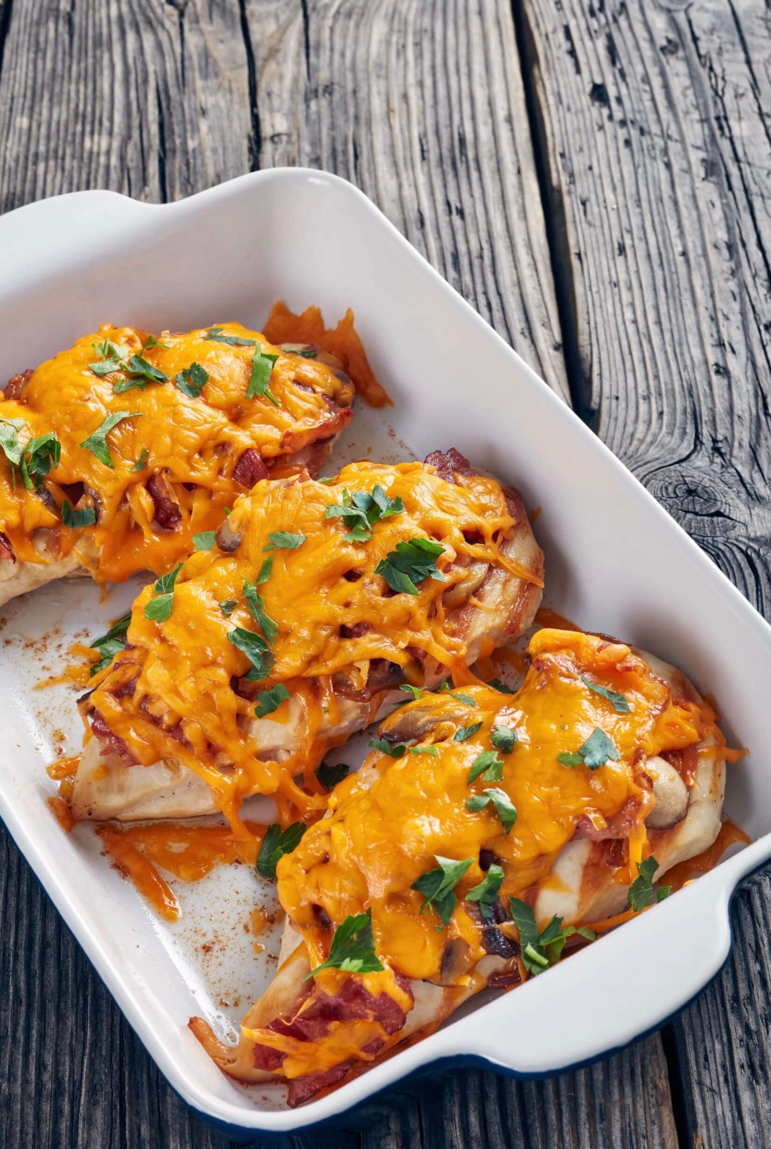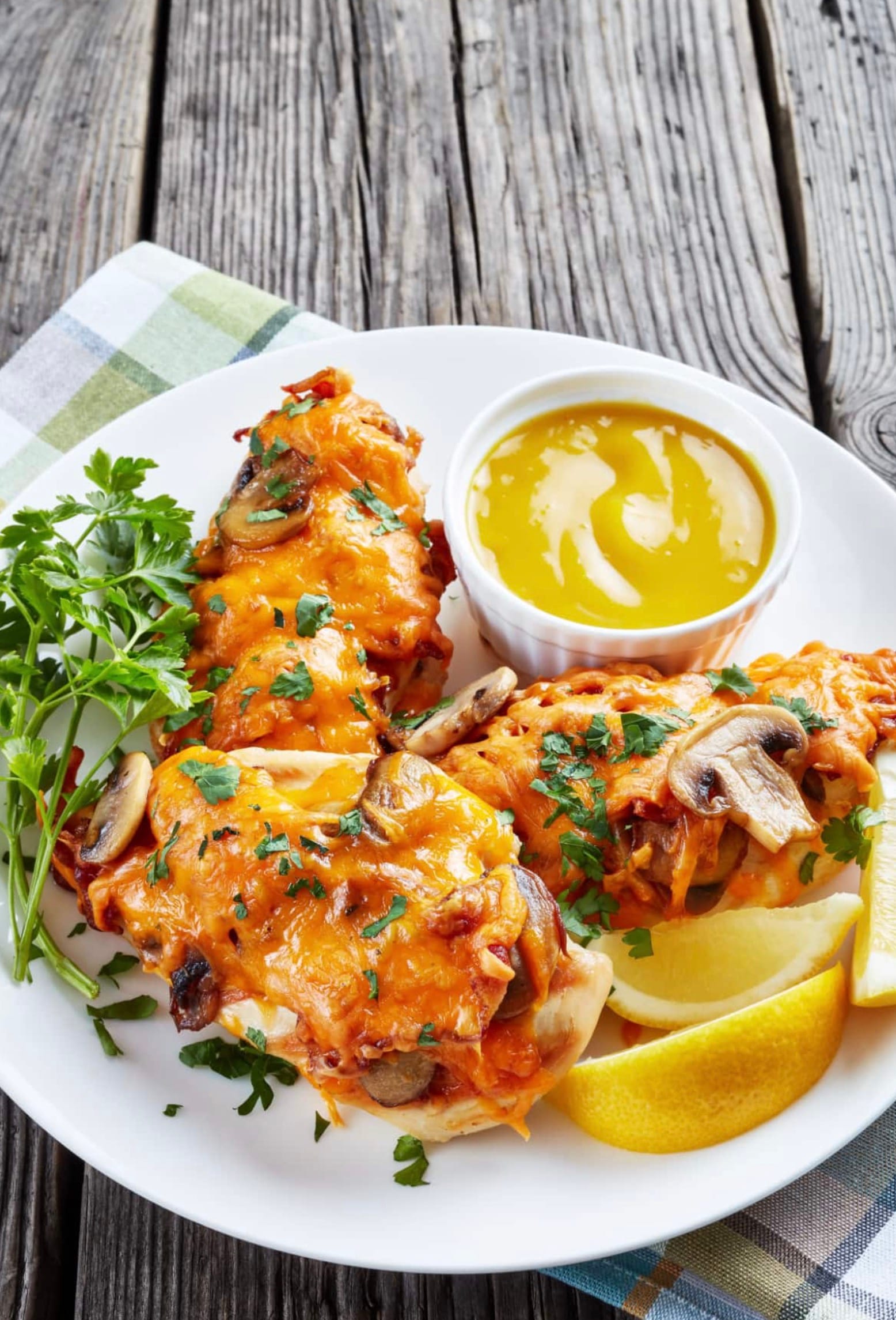 You’ll season the chicken with salt and pepper before cooking. Then you’ll top it with the sauce, mushrooms, bacon, and cheese.