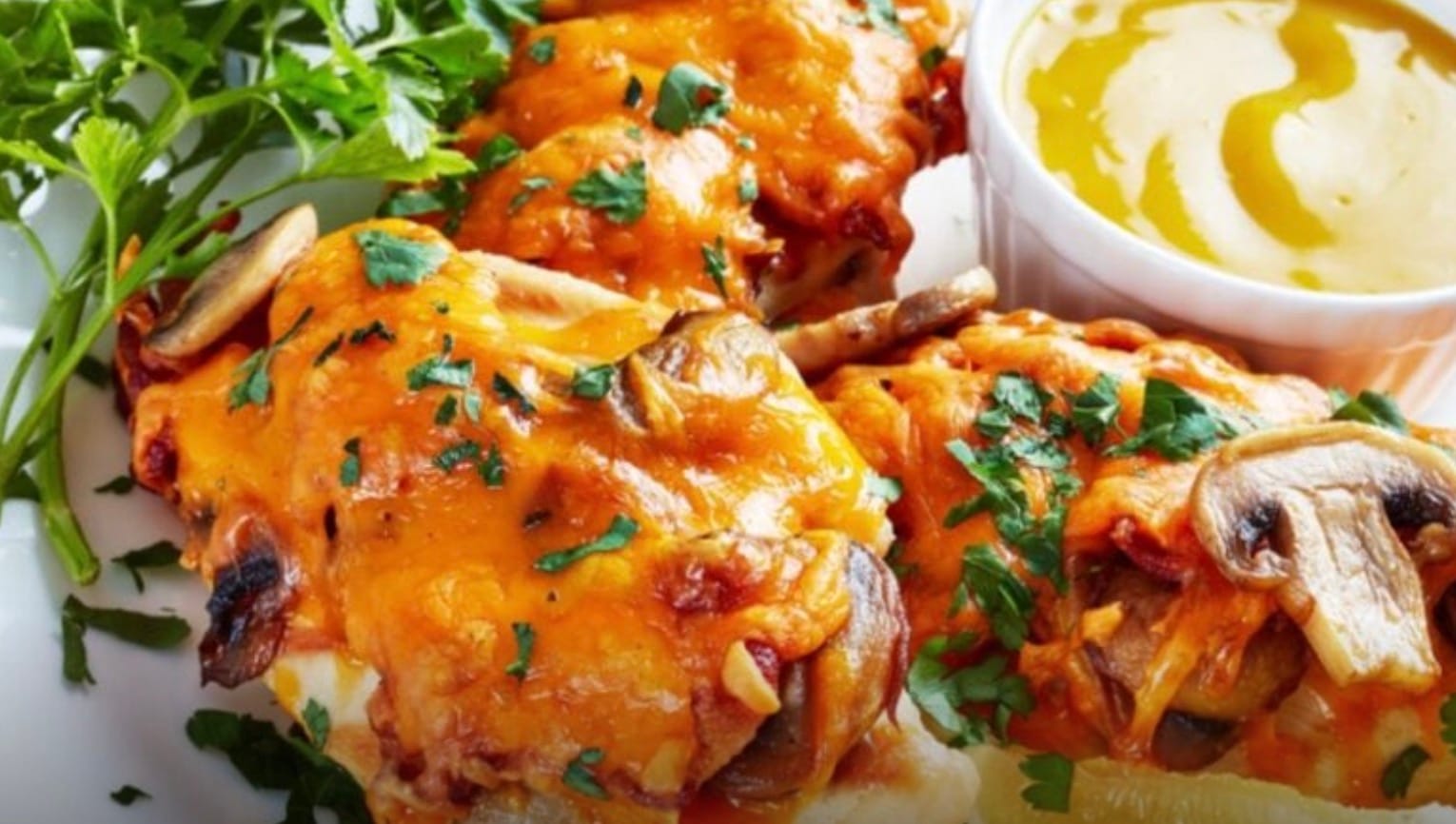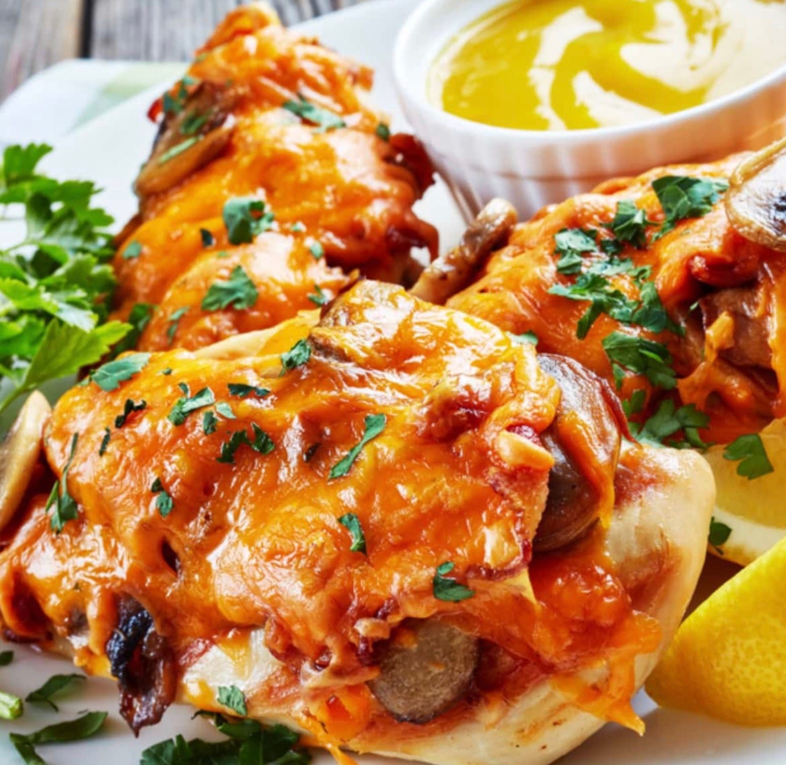 Turn on your oven’s broiler. Put the cooked chicken in a baking dish. Add the saved sauce on top. Sprinkle on mushrooms, bacon, and cheese.