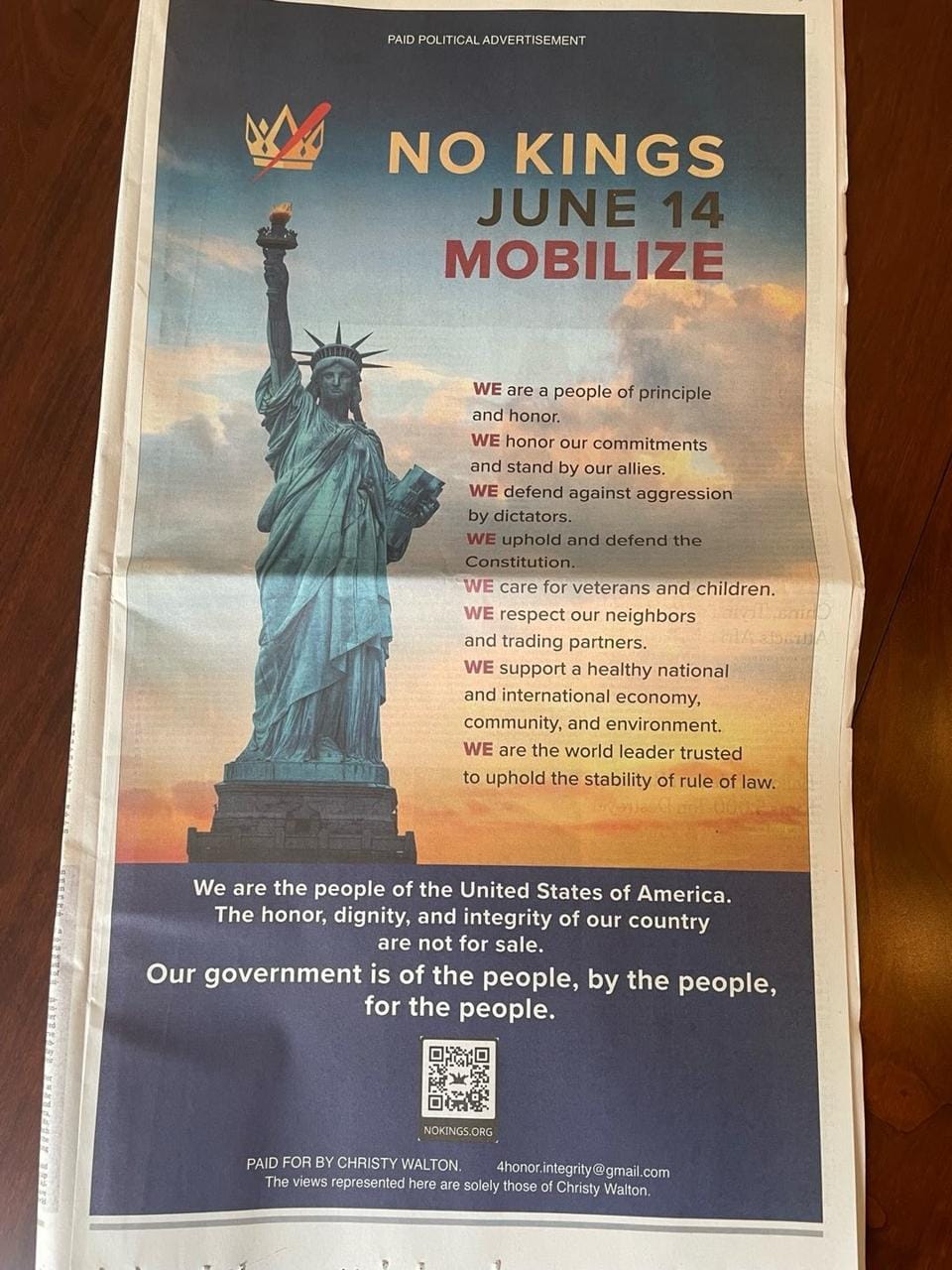 Walton’s ad is connected to the “No Kings” organization, which is coordinating over 1,800 protest events across America according to spokesman Andrew Cook.
