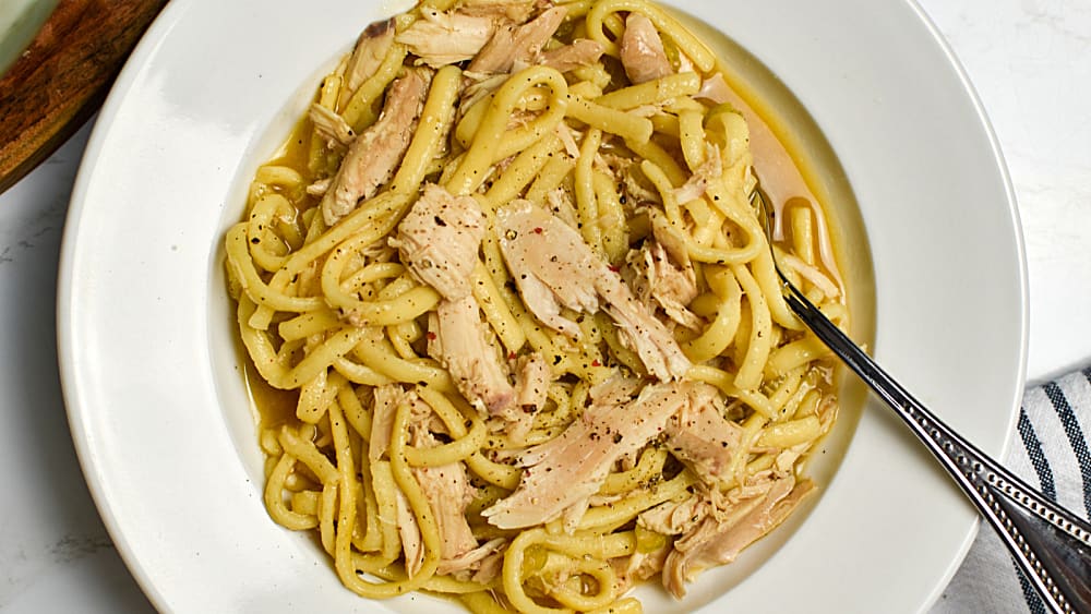 - 8 Add the 12 ounces dried egg noodles and shredded chicken to the boiling broth, stir once to prevent sticking, then cover and immediately turn off the heat. This off-heat cooking method prevents the noodles from becoming mushy while allowing them to absorb maximum flavor.