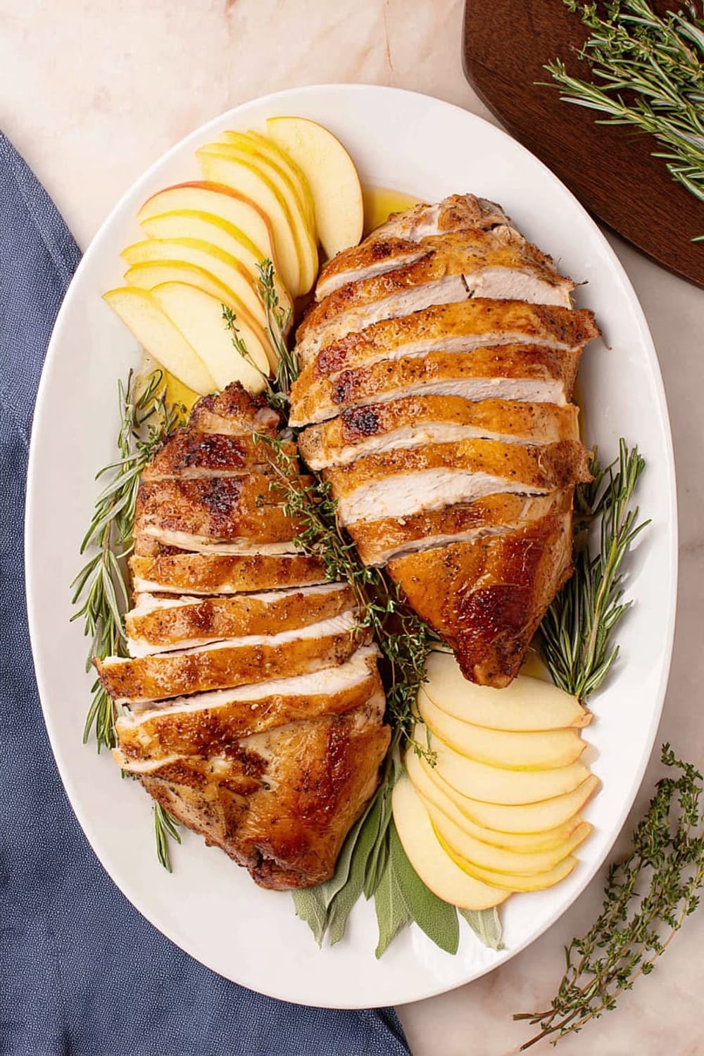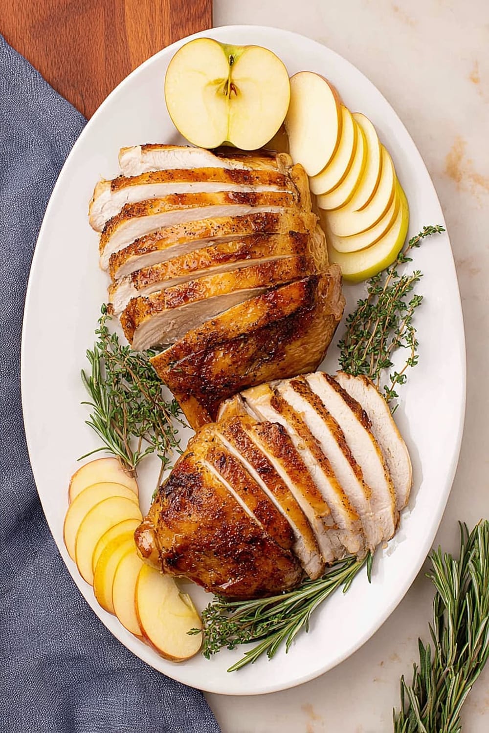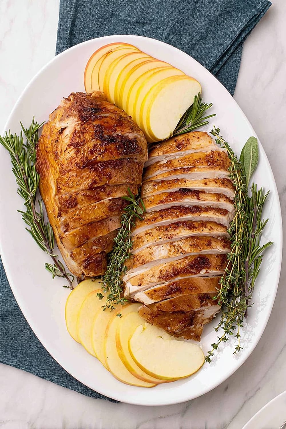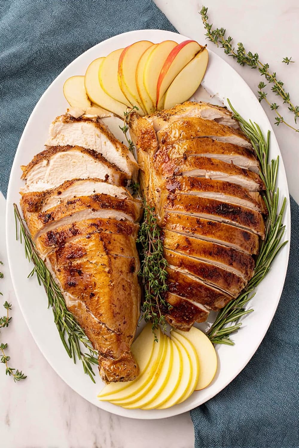 The aromatic spices and apple cider flavors in this turkey pair beautifully with medium-bodied white wines like Chardonnay or Viognier, which complement the herb butter without overwhelming the delicate turkey flavor. For red wine lovers, a light Pinot Noir or Beaujolais works wonderfully with the warm spice profile. Craft beer enthusiasts should try a Belgian witbier or amber ale that echoes the apple and spice notes. Non-alcoholic options include sparkling apple cider, cranberry juice mixed with ginger ale, or herbal teas like chamomile or sage.