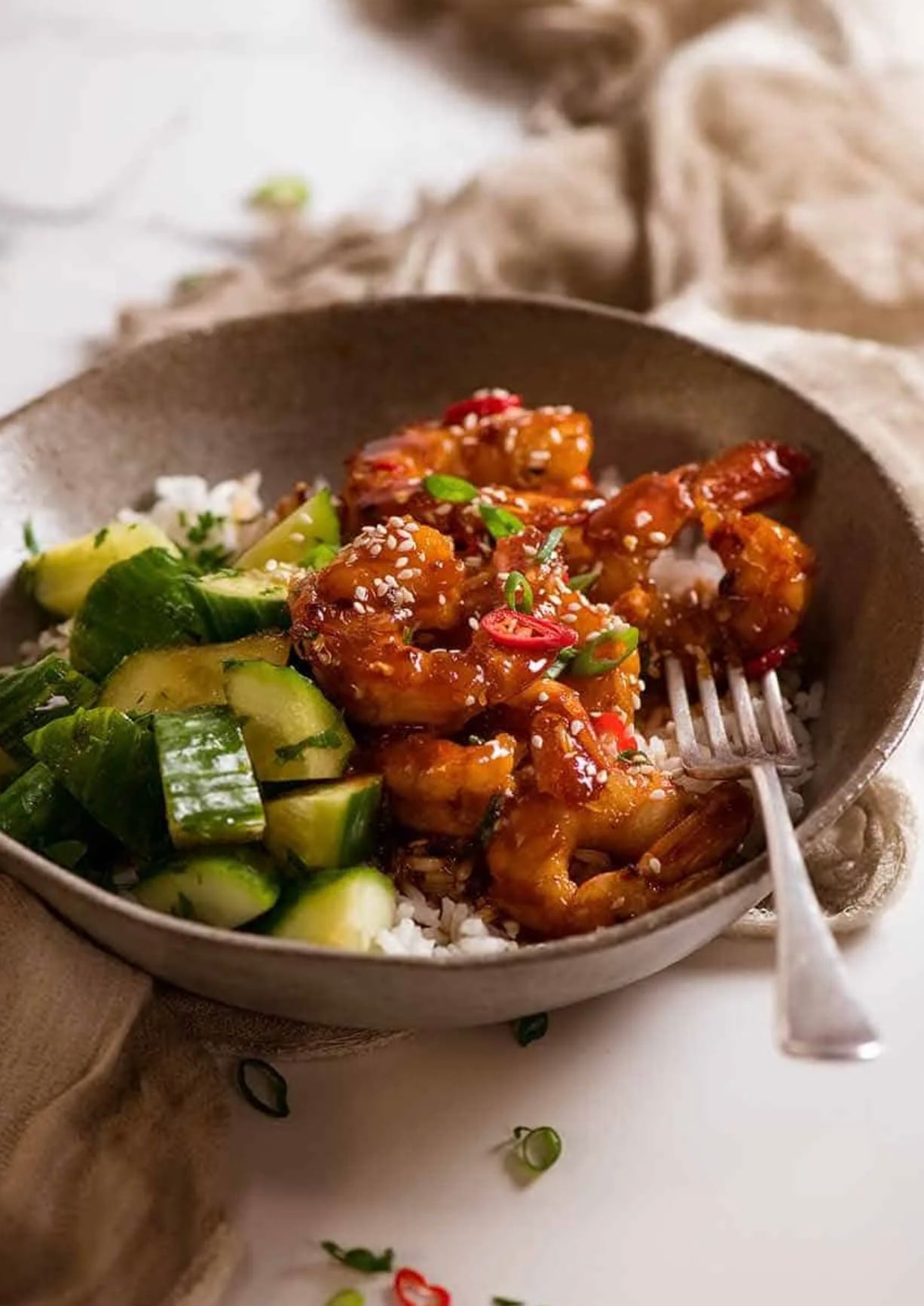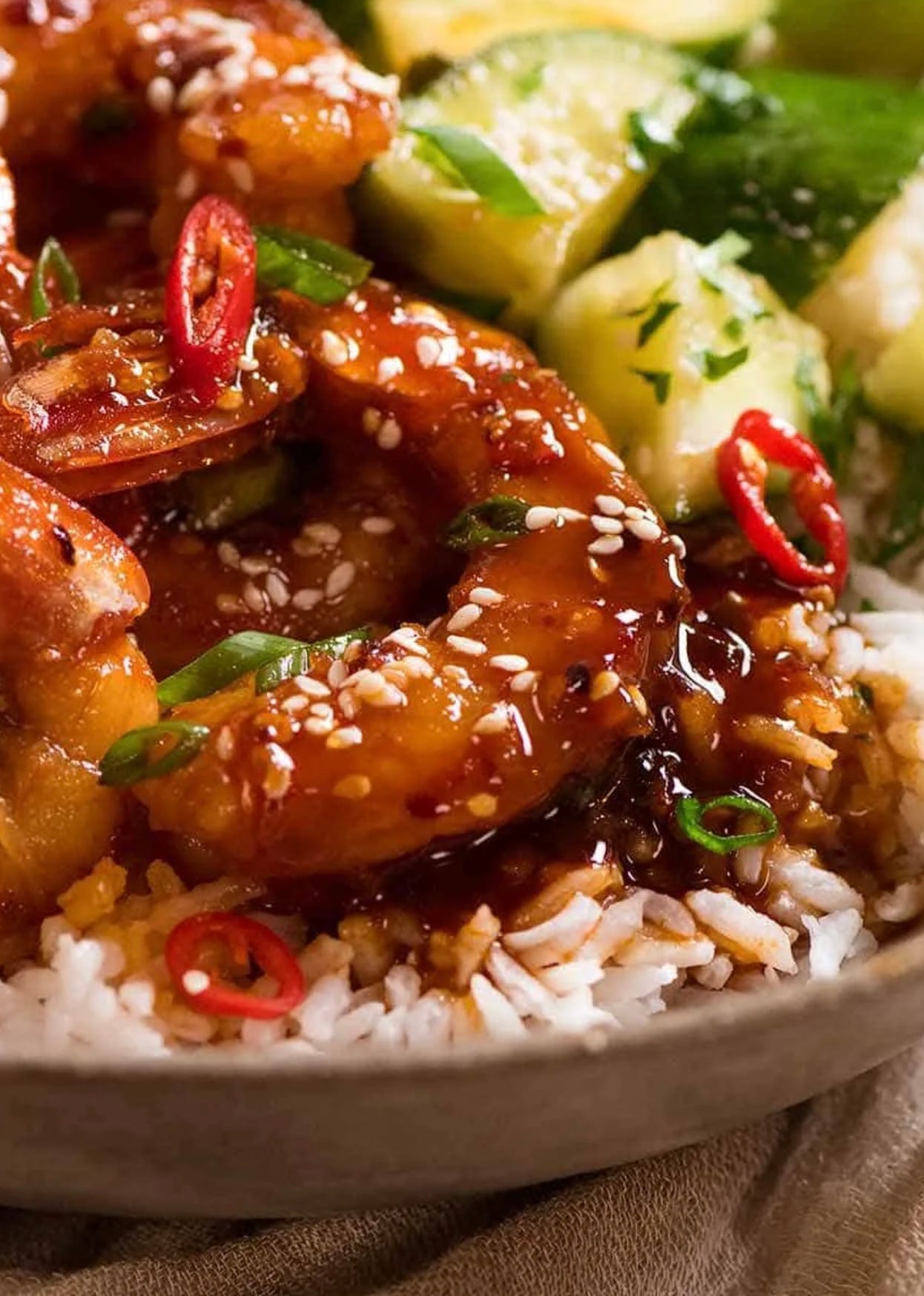 Sprinkle on some sesame seeds, sliced green onions, and chopped red chilies if you like. Serve your yummy prawns with rice to soak up all that tasty sauce!