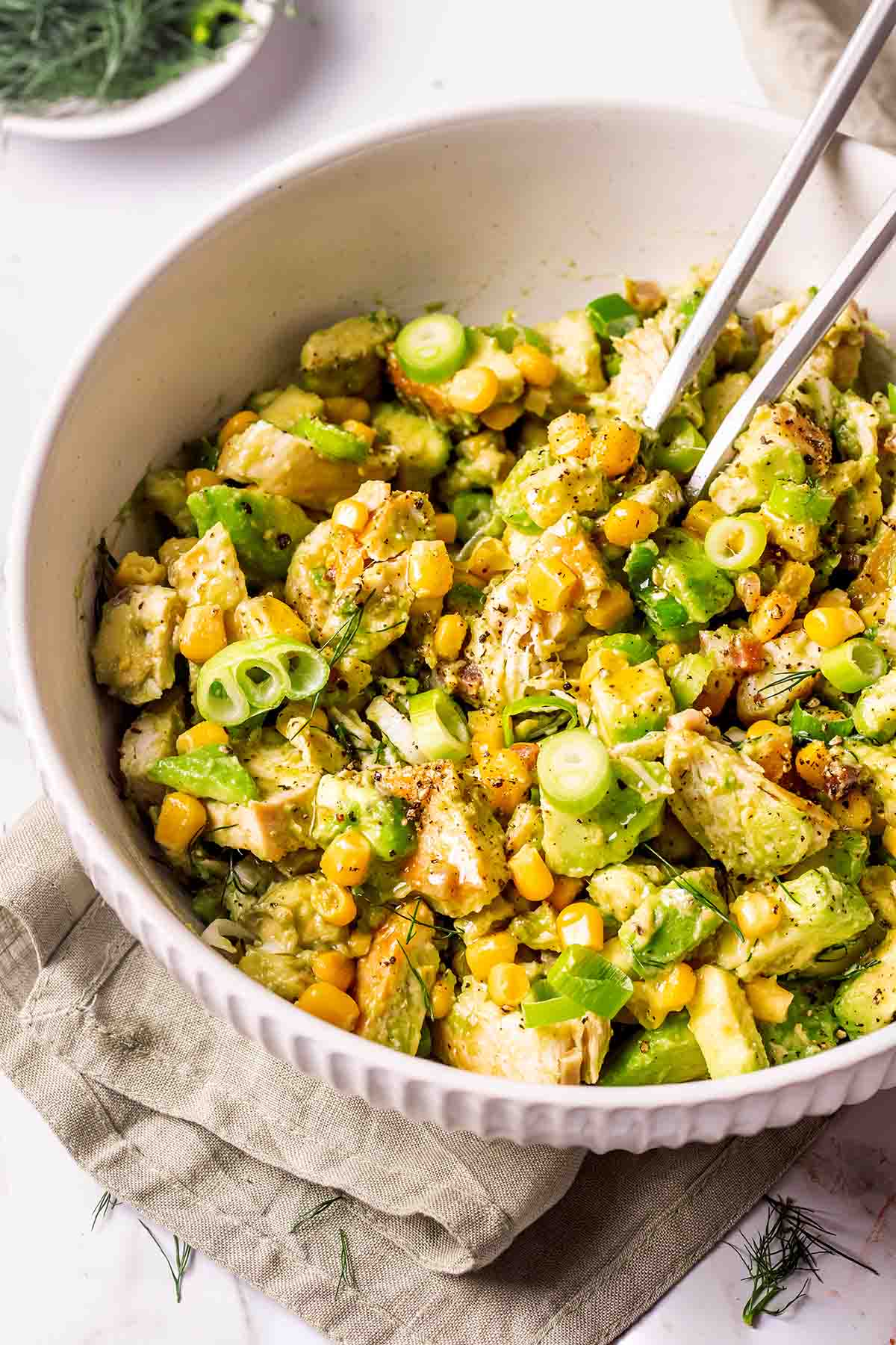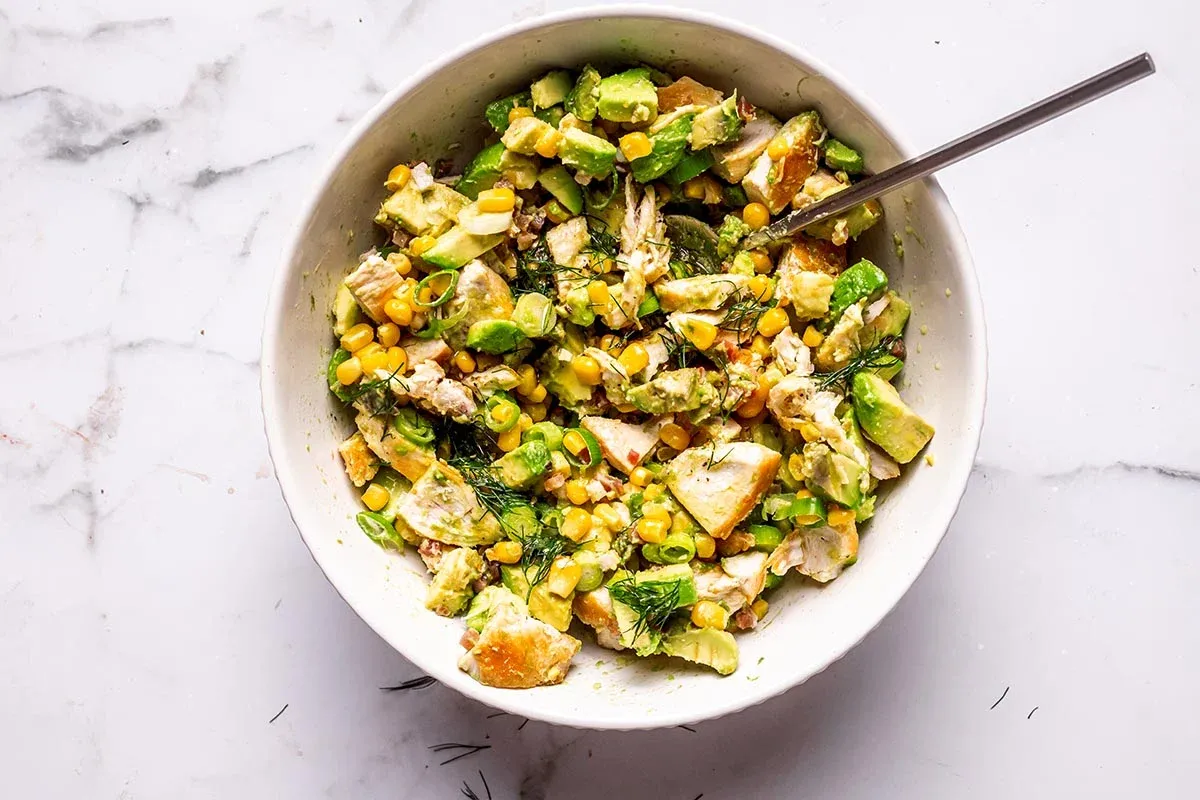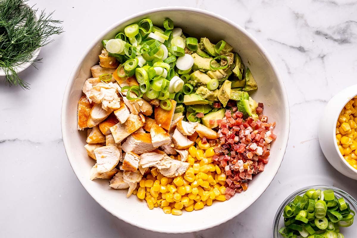Grab a big salad bowl. Toss in your sliced chicken, diced avocados, corn, bacon bits, and sliced scallions.