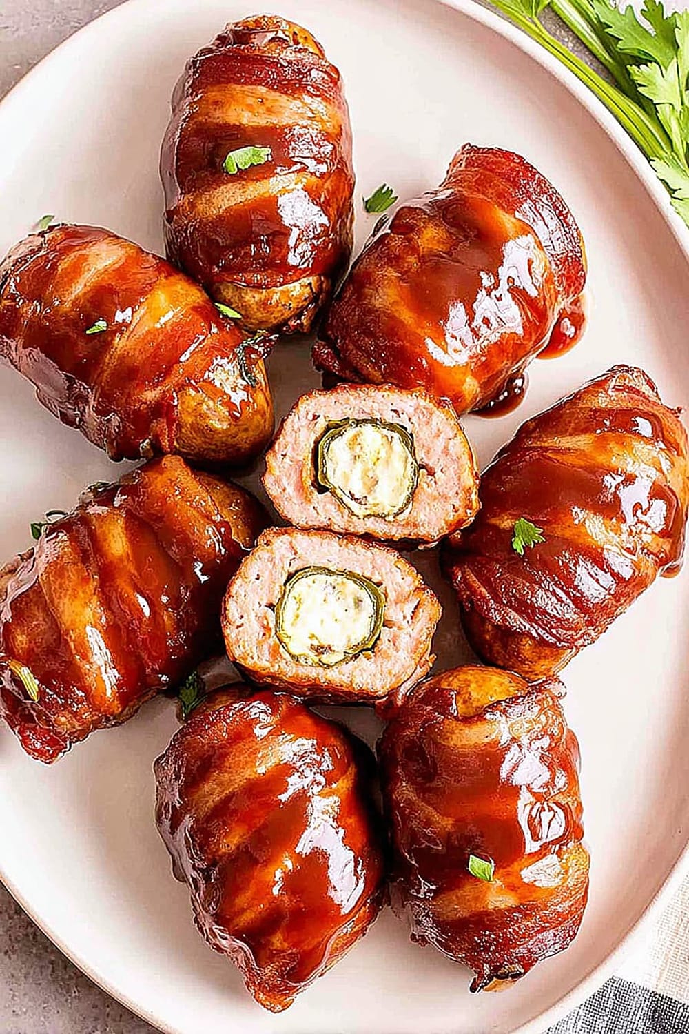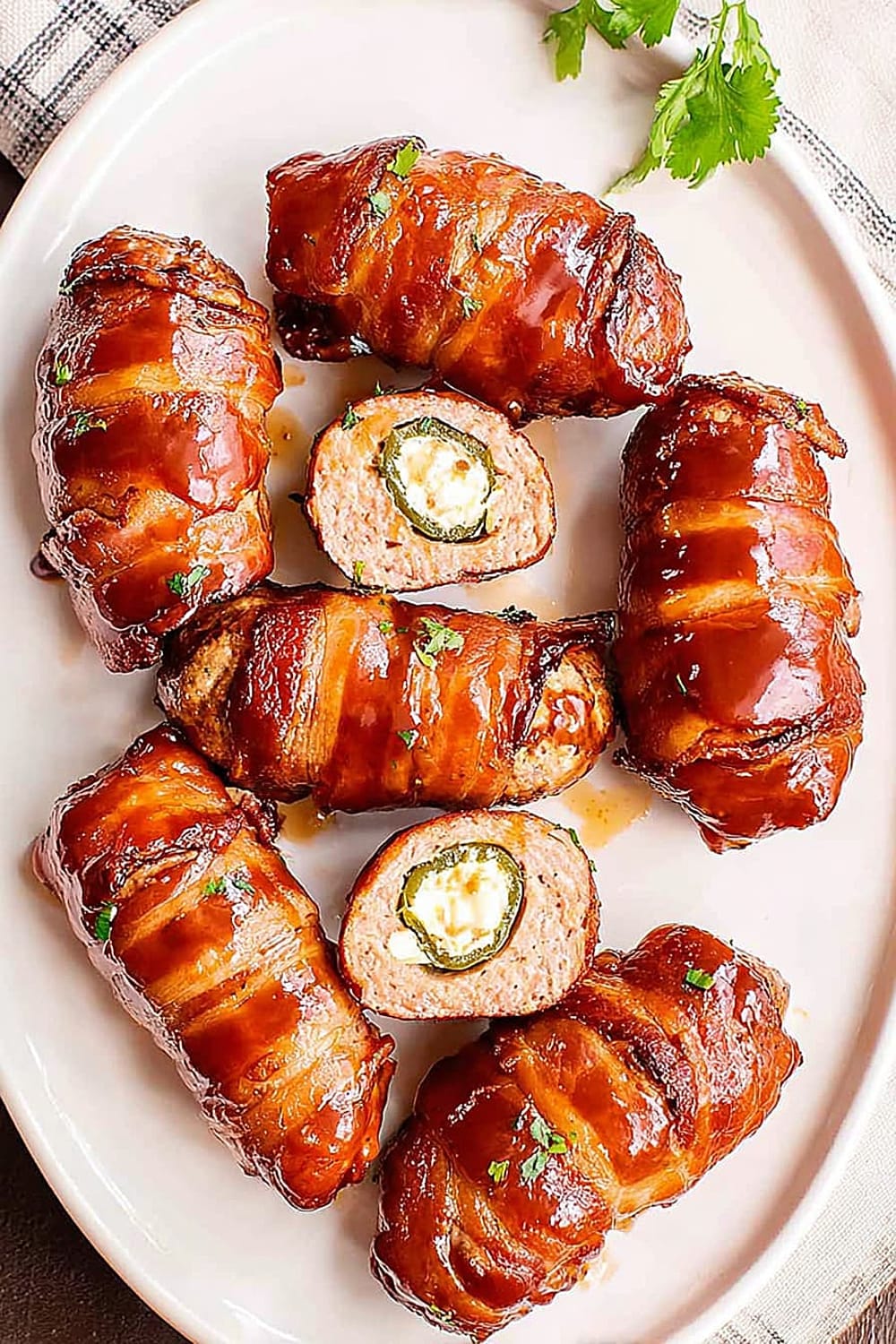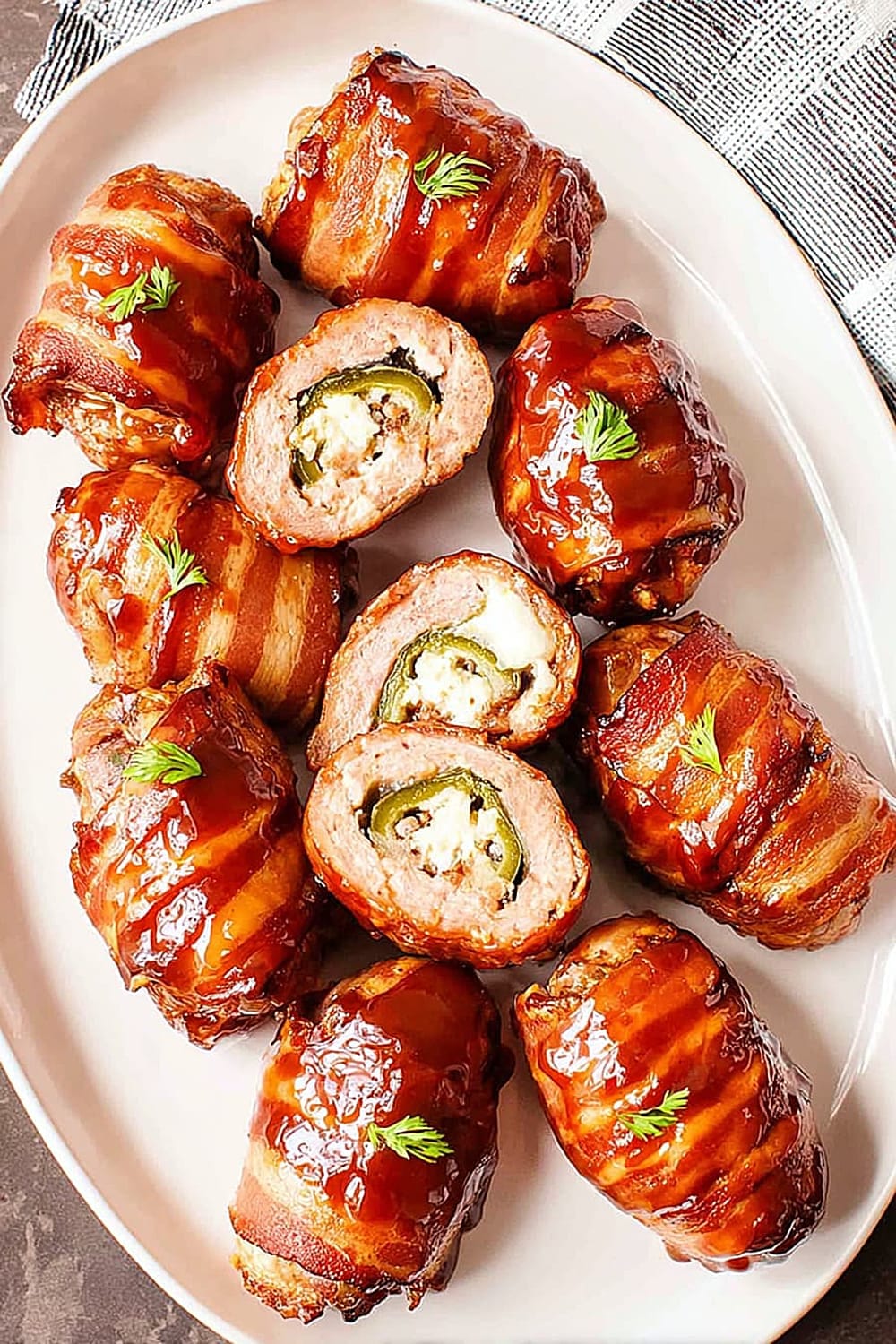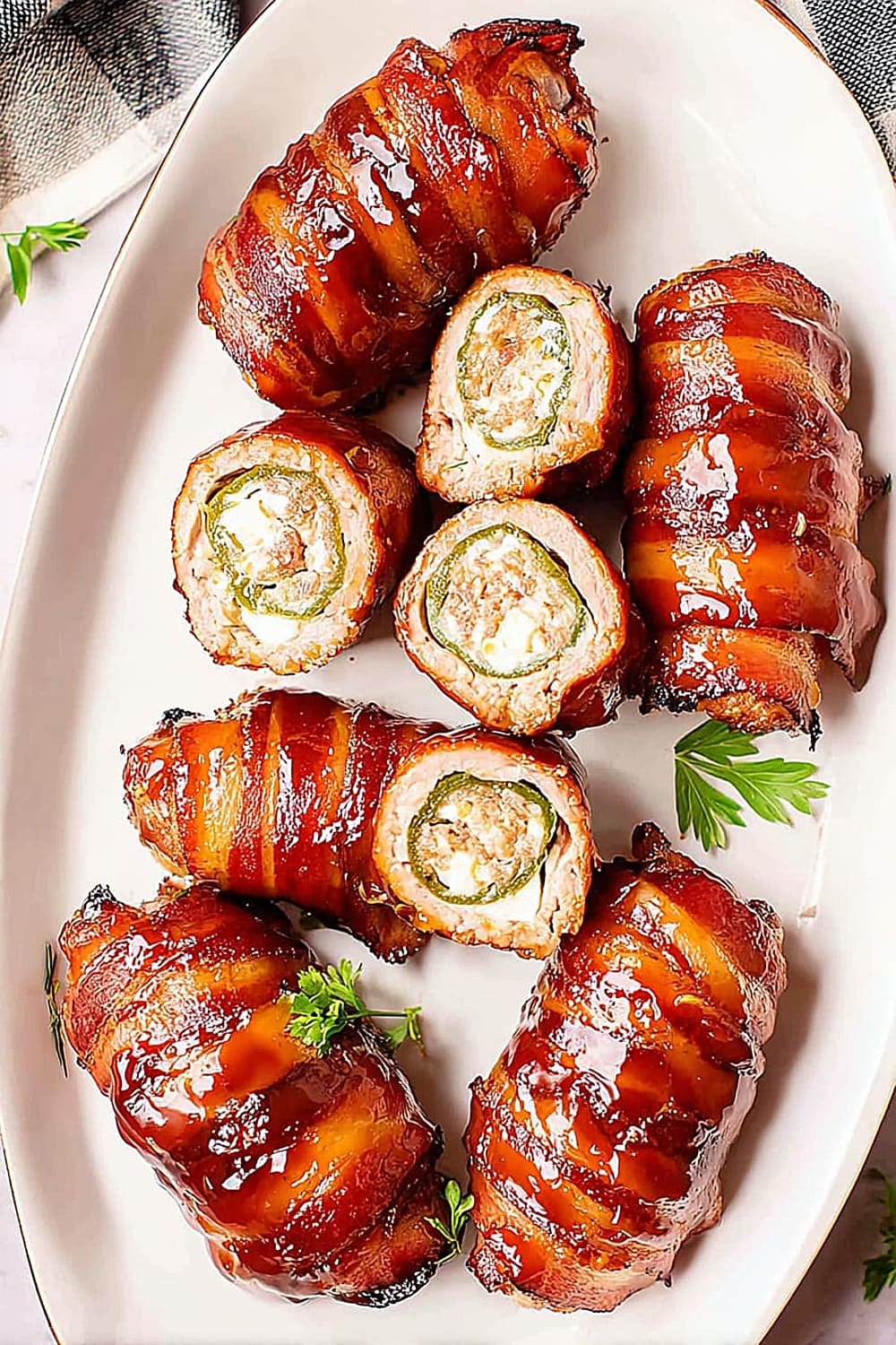 Picture this: creamy, spiced cheese filling nestled inside a perfectly hollowed jalapeño, wrapped in savory pork sausage, then hugged by crispy bacon and finished with a glossy barbecue glaze.