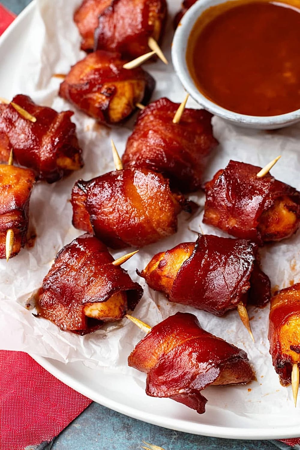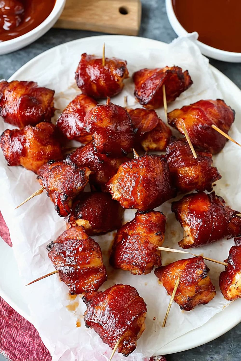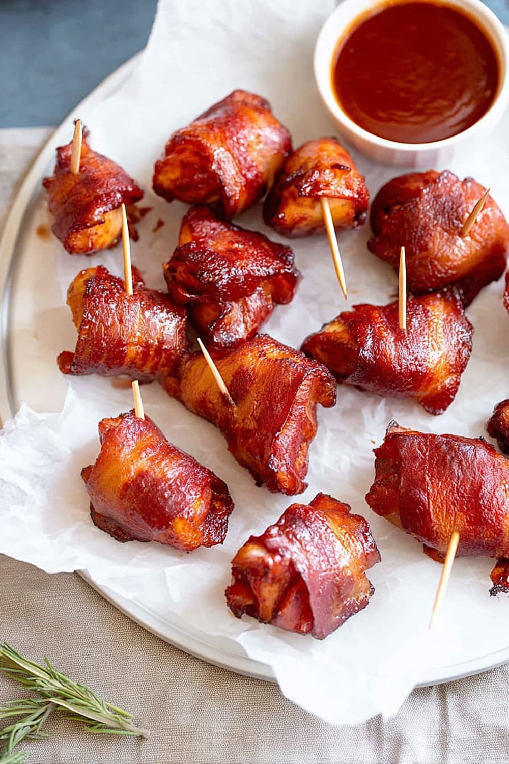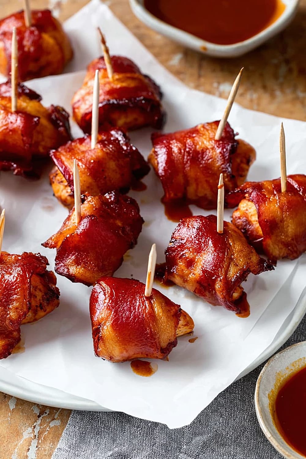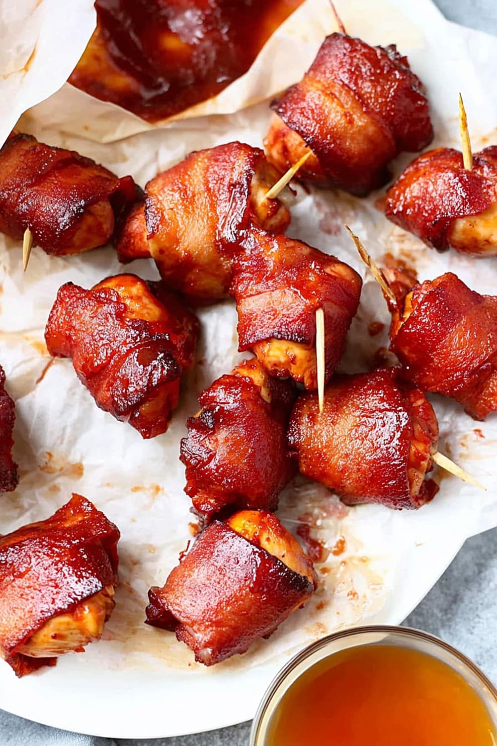 - 10 Let the bites rest for 2-3 minutes before serving to allow the juices to redistribute and the glaze to set slightly. Serve immediately while the bacon is still crispy and the chicken is hot and juicy.